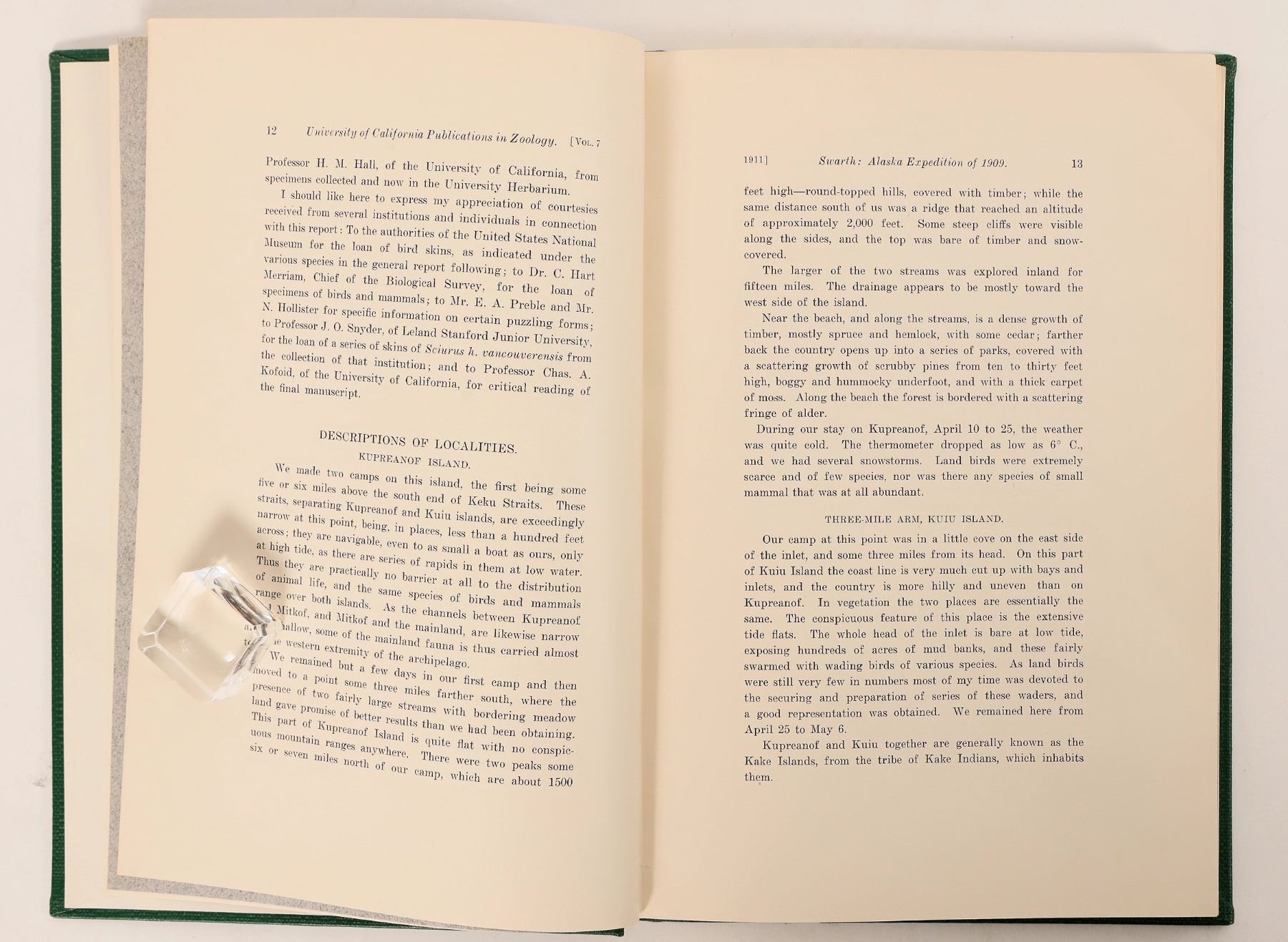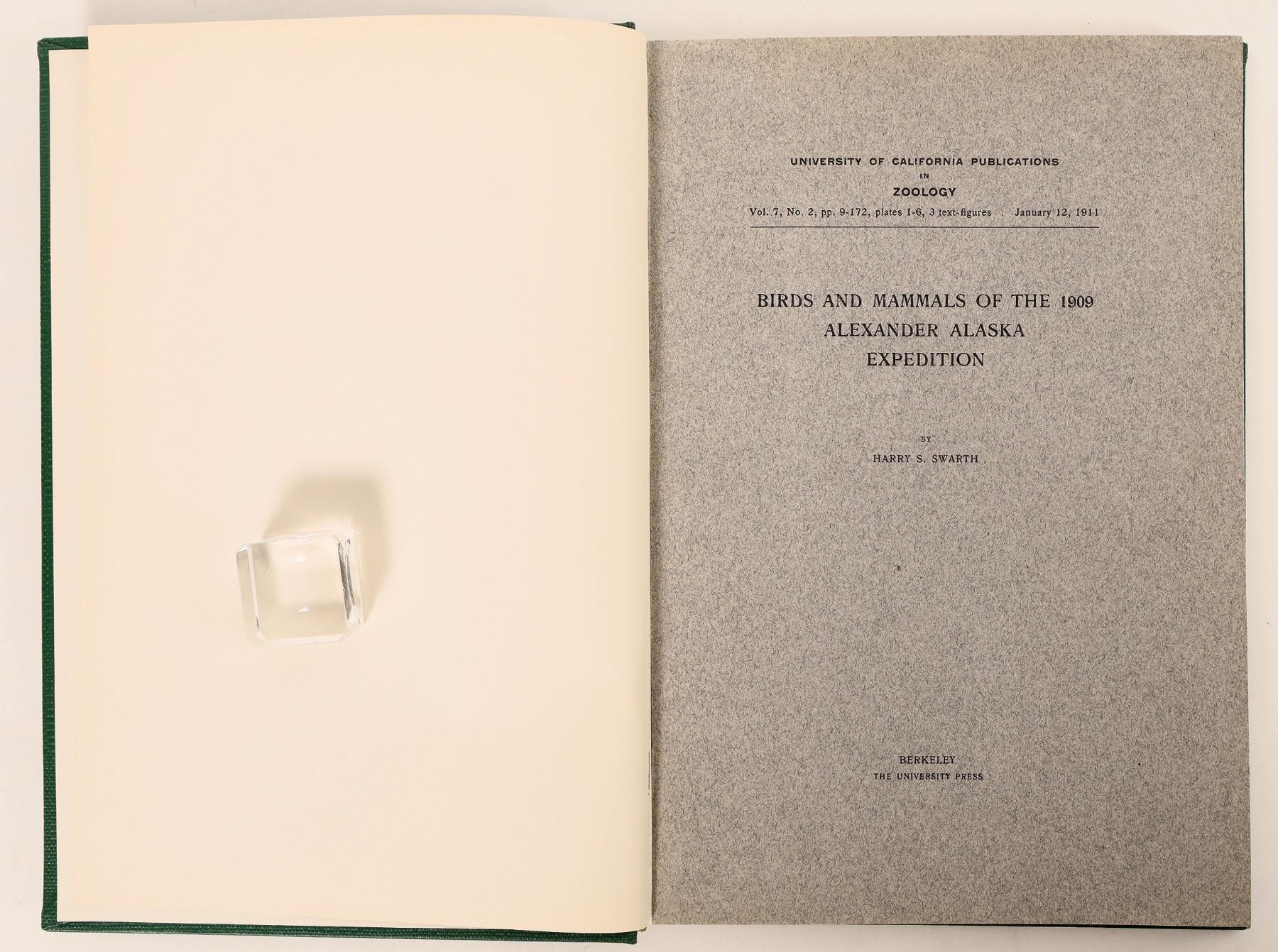 Bound, Birds & Mammals of the 1909 Alexander Alaska Expedition by Swarth. 162pp. Page cover has corner tape repairs. Foldout map and lots of bird and animal descriptions.[ Alaska