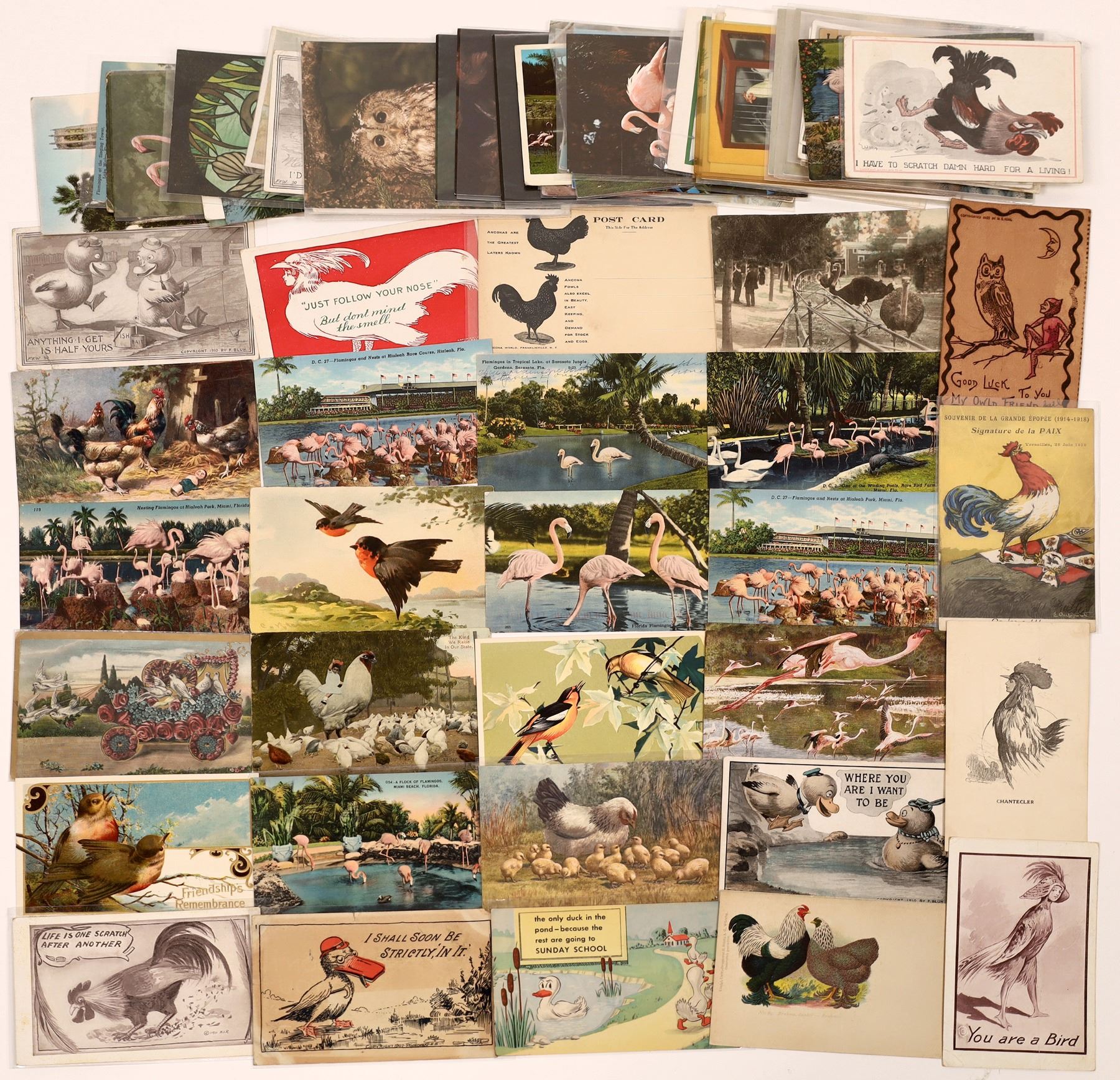 Lot of 65. Mostly prints of various colorful birds including flamingos, roosters and owls: Collection includes one leather card (c. 1905), five B&W photos/RPCs, approx. 20 modern era cards and approx. 40 chromolithos,