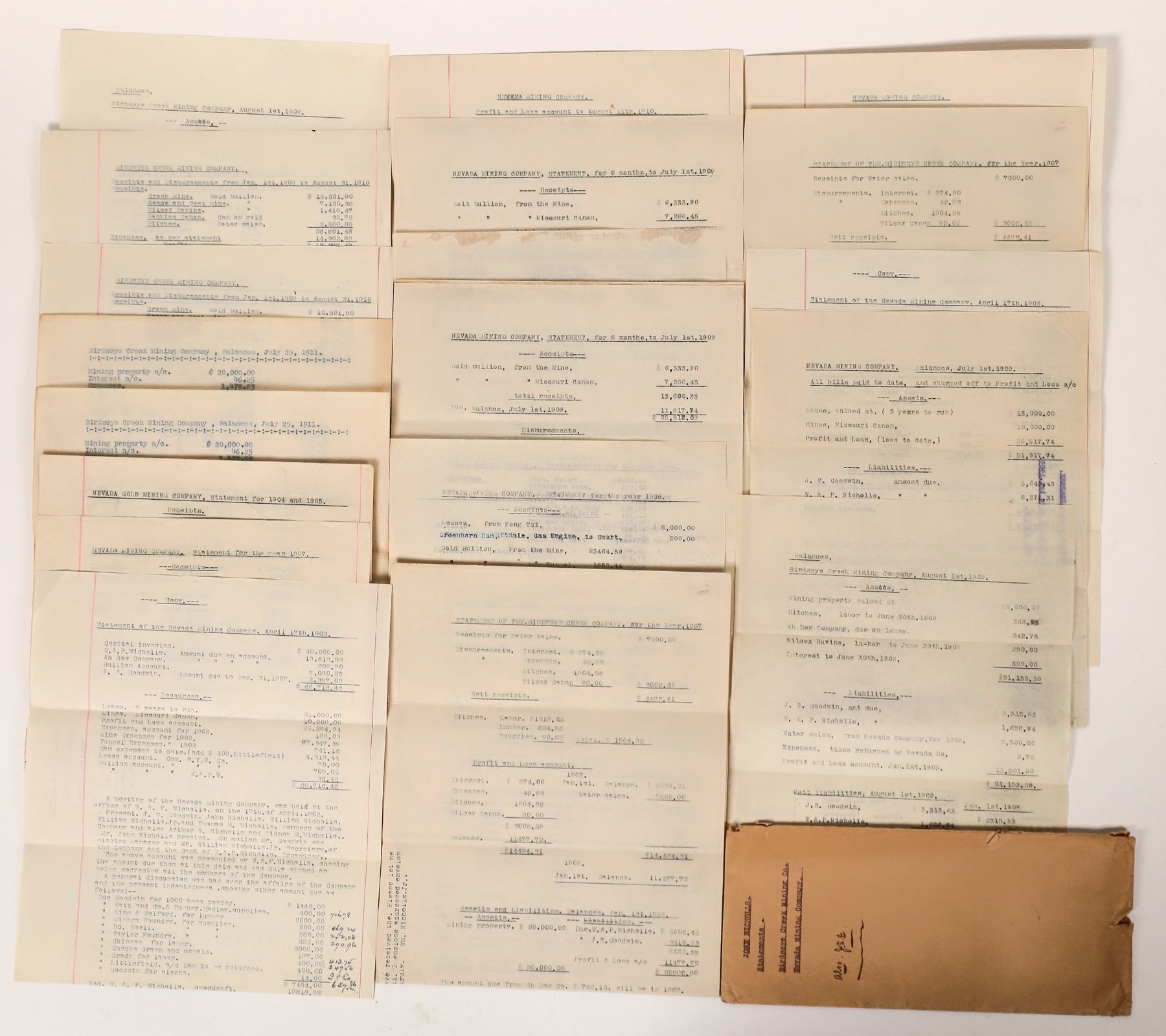 A collection of pages showing expenses and income for the Birdseye Creek section of the Nevada Mining Company in the early 1900s. All in nice condition. Please see photos for more details. Nevada 1900s