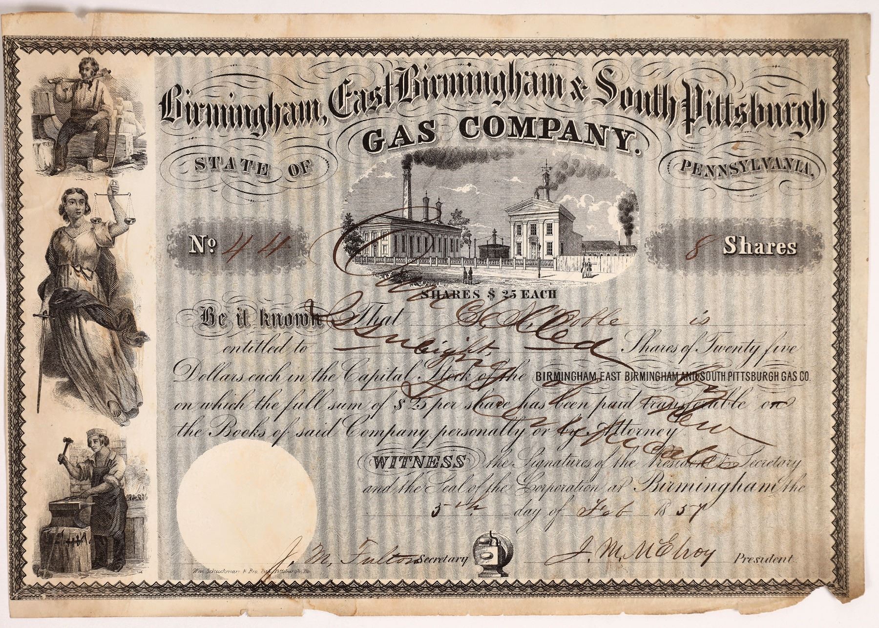 No. 44, issued for 8 shares to Noble in Birmingham, February 1857. Signed by J.M.M. Elroy and secretary JM Fulton. Pen cancelled. Attractive design with allegorical and industrial vignettes (left border) and vignette of factory (top center). Printed by Wm. Schuchman & Bro., Pittsburg. Stains, rough bottom edge. 6.75 x 9.75"
