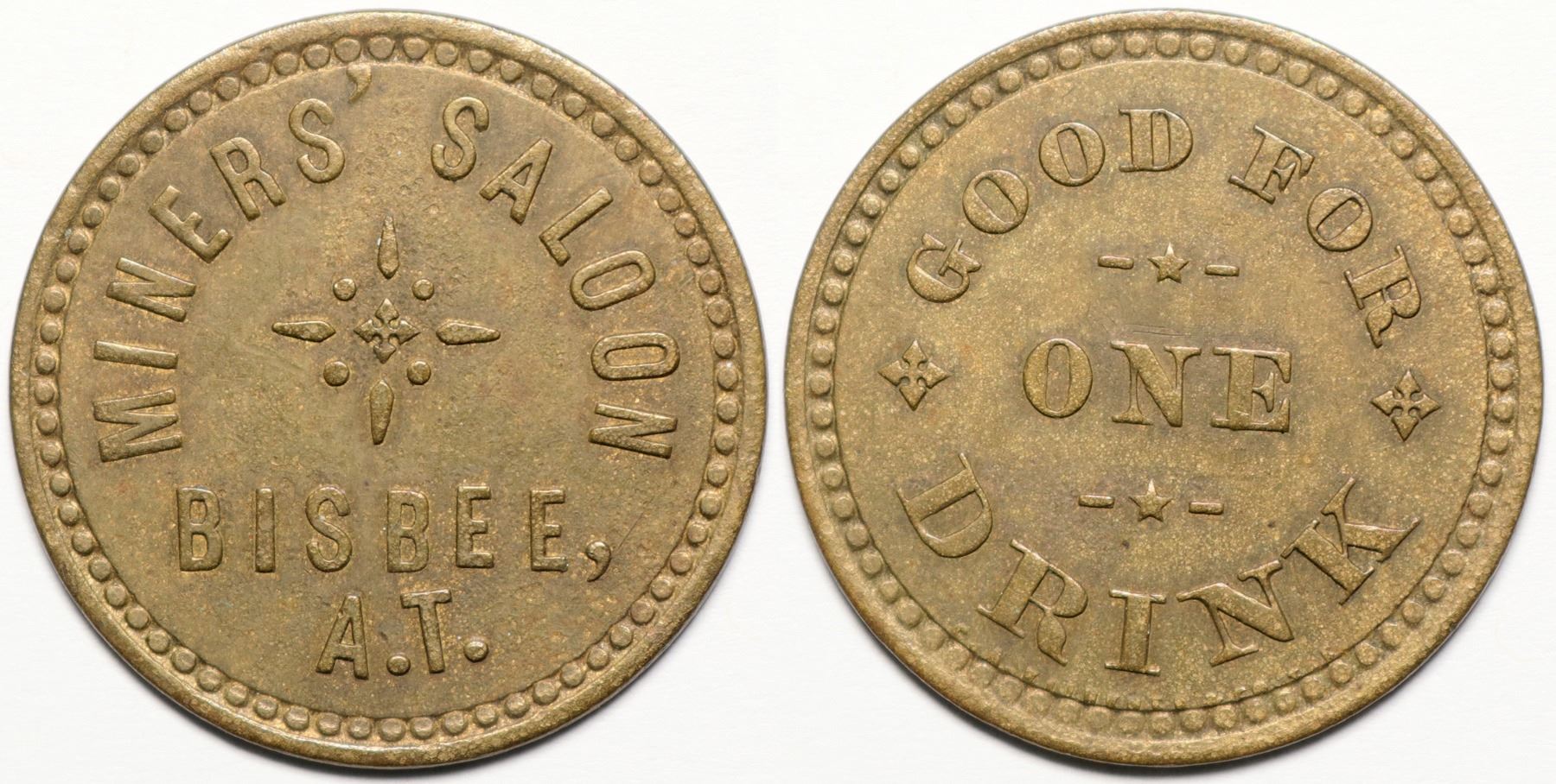 Miners' Saloon, Bisbee, A.T.//Gf/One Drink. Br. Size: 1" The "Miner's Saloon was one of the last areas of the Old West, and operated before 1902 until prohibition was introduced. It went dry on January 1, 1915. Bisbee was a mining town, and once the largest cit between New Orleans and San Francisco, The Saloon was down the road from the Tombstone, and the Red Light District. Bisbee is the County seat of Cochise Arizona, the Copper mining town was established in 1880 was named after the judge.