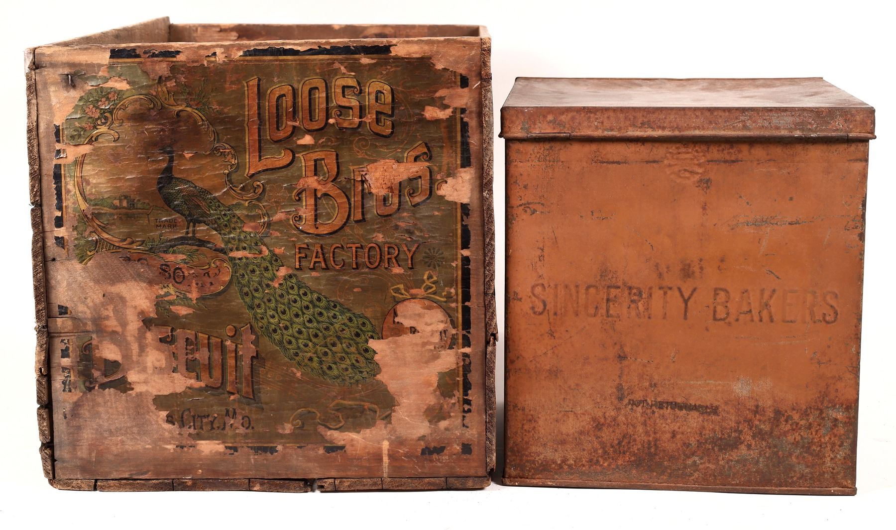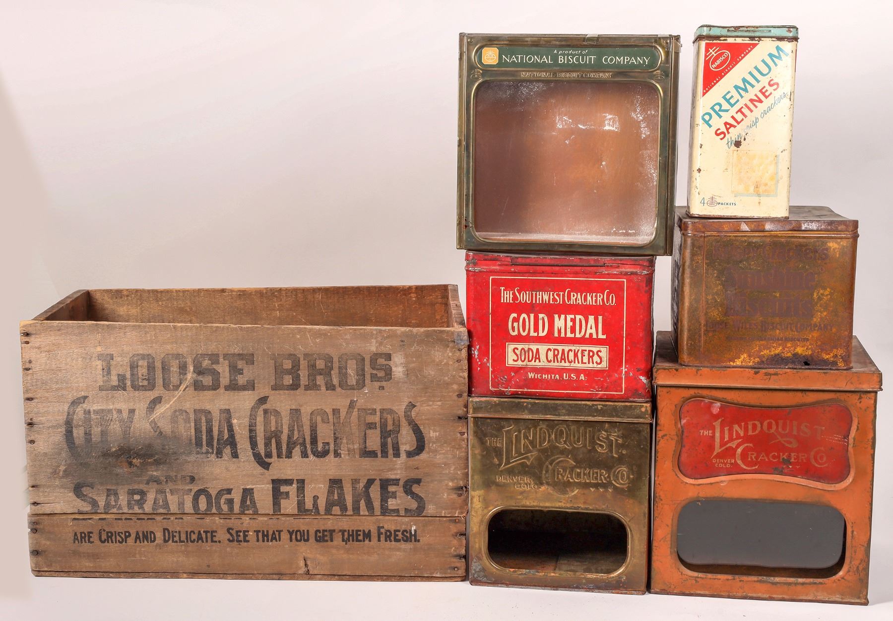 7 different biscuit and cracker boxes. Wood J J Pierson, Parsons, KS 13x22x13". Metal-Lindquist Cracker, Denver, Colo. 10x9x9", and glass window dispenser 12x10.5x10.5". Sunshine Biscuits, 7x9x8", rust and paint loss. Nabisco Saltines, 9x4.5x4.5", lid dent and some rust. Clear face brass and wood National Biscuit 3x10.5x10.5". Gold Medal, Wichita, 7.5x9x8", dents, some rust, paint loss. Gary Bracken Collection