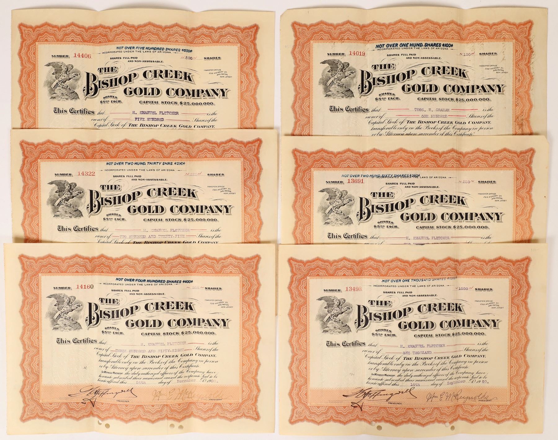 Lot of 6 issued stocks, 1909-10. Inc. in Arizona. Orange border, black print, and eagle vignette. Signed by president Wm. McReynolds and the treasurer. Punch cancelled. Folds. Rare group. District is on east side of Sierra Nevada mountains in northwestern Inyo County, approx. 15 miles southwest of Bishop. Principal source of gold in the district has been the Cardinal or Wilshire-Bishop Creek mine, in production during 1900's and from 1933 to 1938. Estimated total production of more than $1 million. Ore deposits occur in a zone of quartzite enclosed in granitic rocks. There are bodies up to 8' thick and contain fine free gold and fairly abundant pyrite, pyrrhotite, chalcopyrite, sphalerite and arsenopyrite. Deposits developed to a depth of 600'.