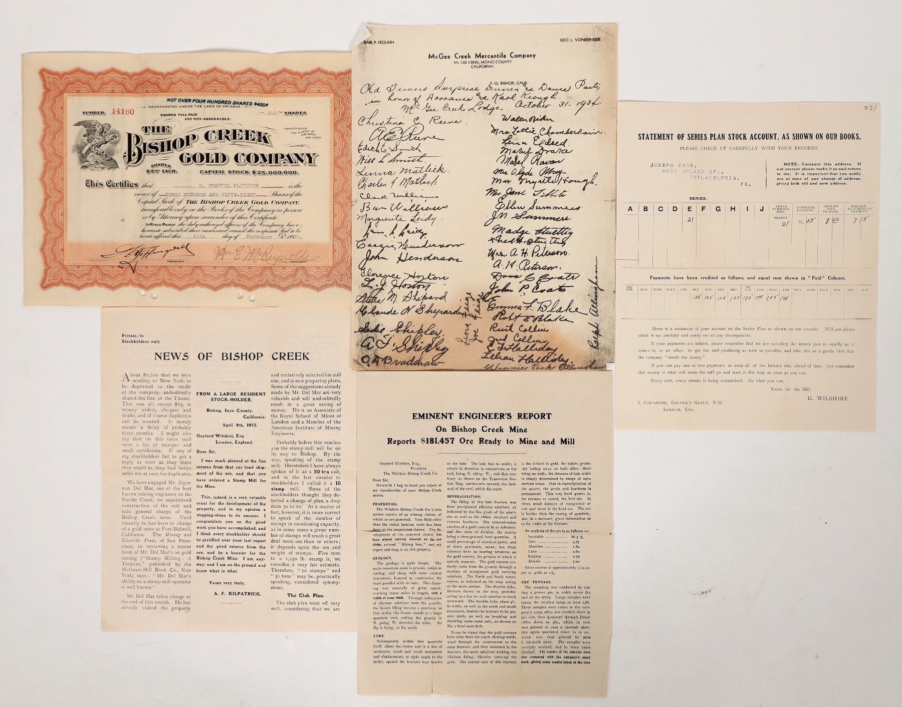 Eminent engineer's report, $181,457 ore ready to mine-creases and tears, 1912 News of Bishop Creek-creases and tears.1909 Bishop Creek Gold stock. British stock statement, McGee Creek Mercantile Xerox.