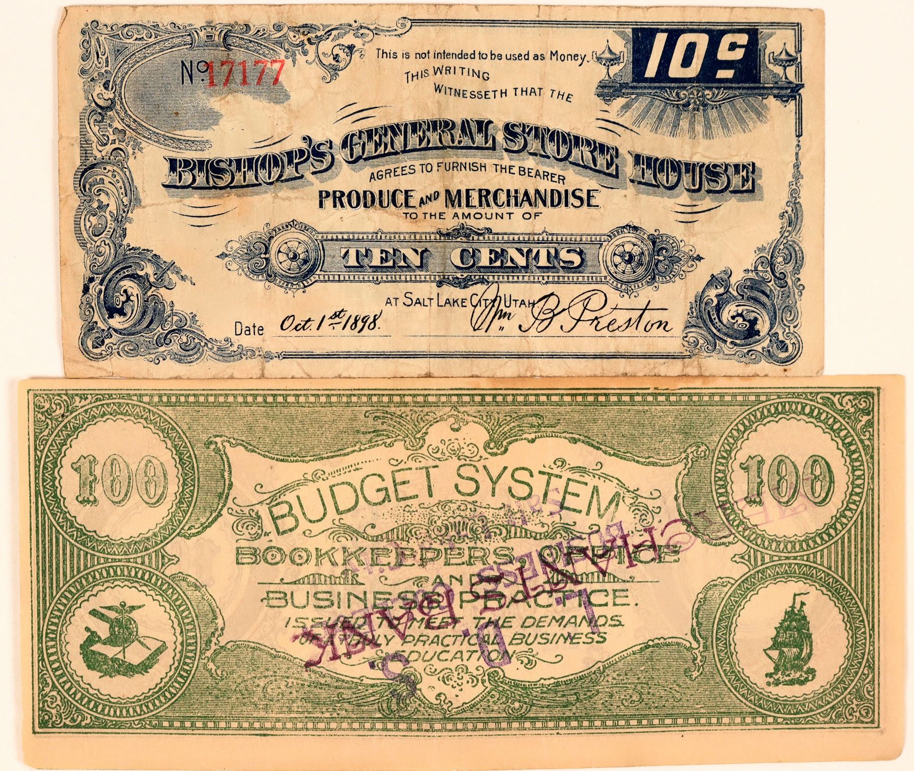 1898 scrip for 10 cents from the Bishop's General Store House; also $100 note from a business college in Salt Lake City.