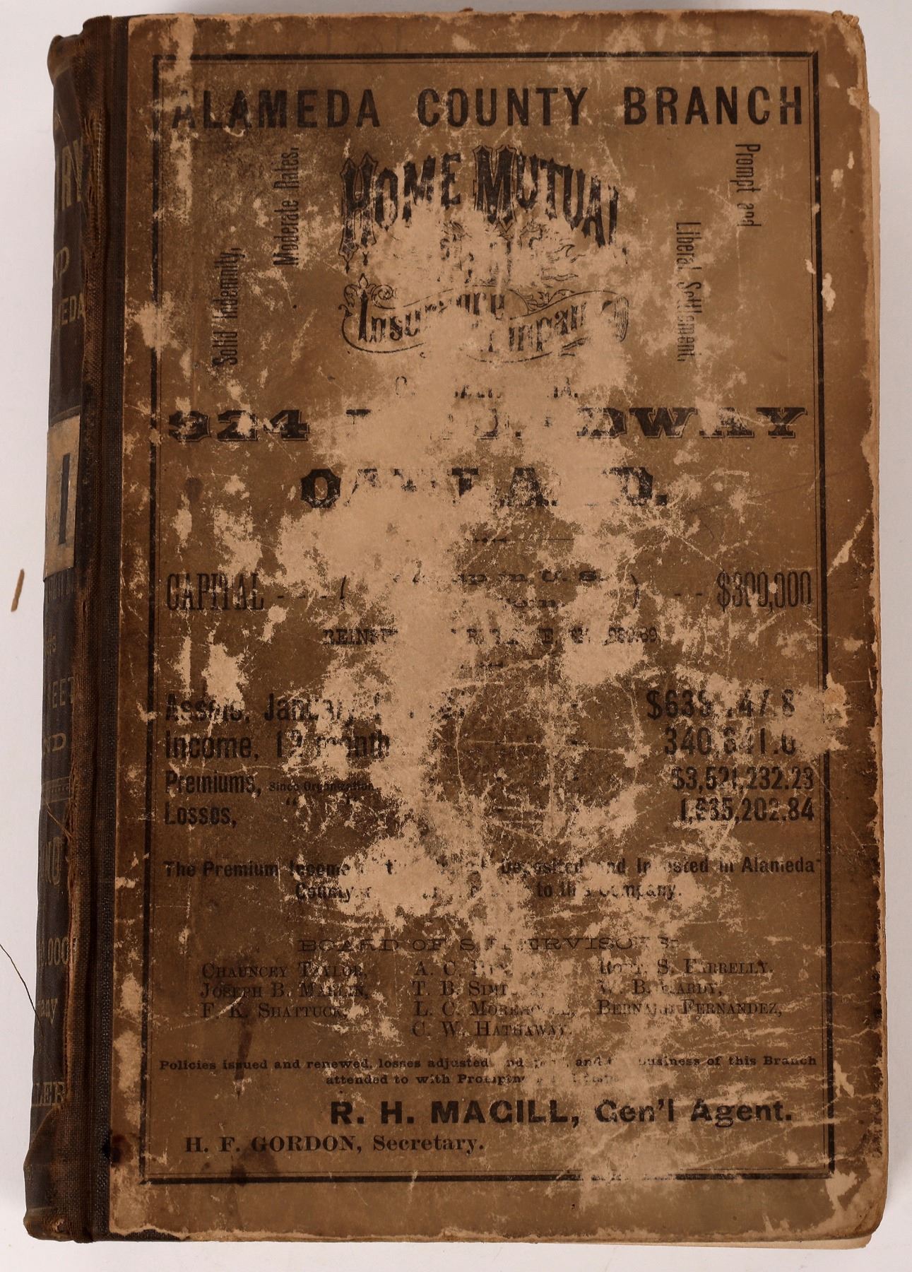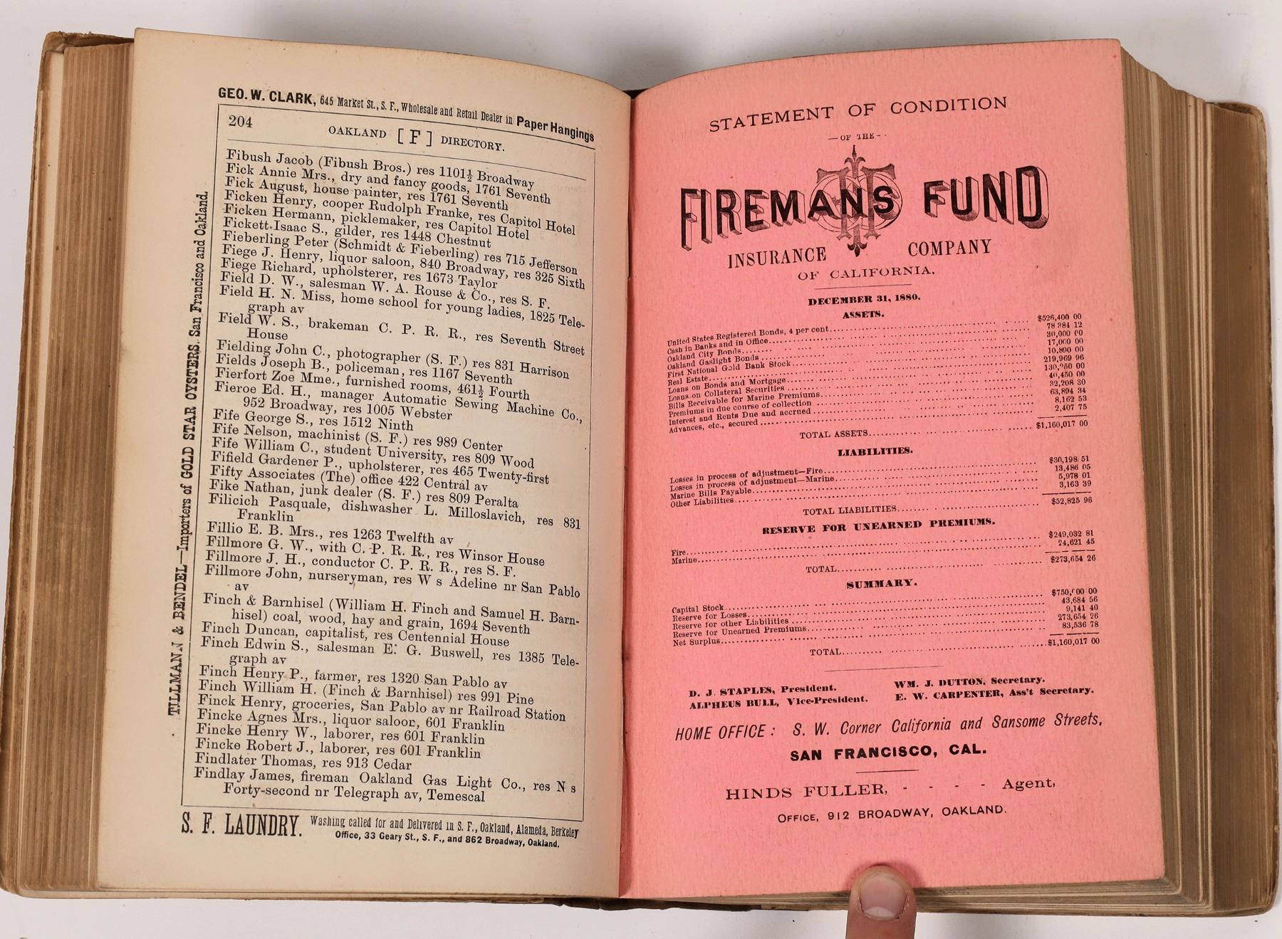 Bishop's Oakland Directory. Business directory, street guide, and a record of the city government. Also serves for Berkeley and Alameda. Contains statistics and addresses for Oakland, Berkeley, and Alameda. 1881-1882. Good condition. 8.8 x 6 inches. State:California City:Oakland Date: 1881-1882 Provenance: Ron Lerch Collection