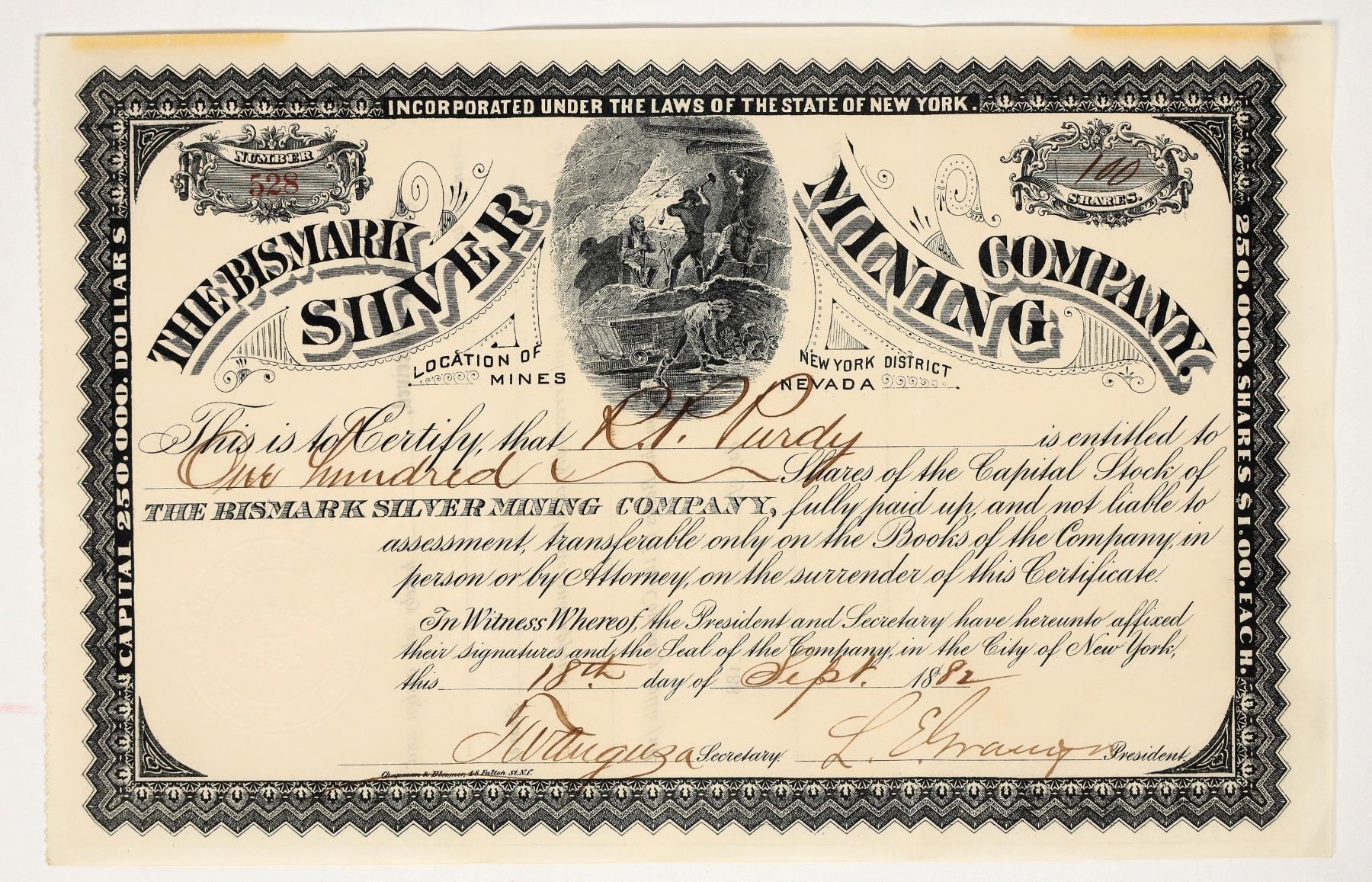 Bismark Silver Mining Company Stock Certificate, Lincoln County, NV, 1882 [204145]