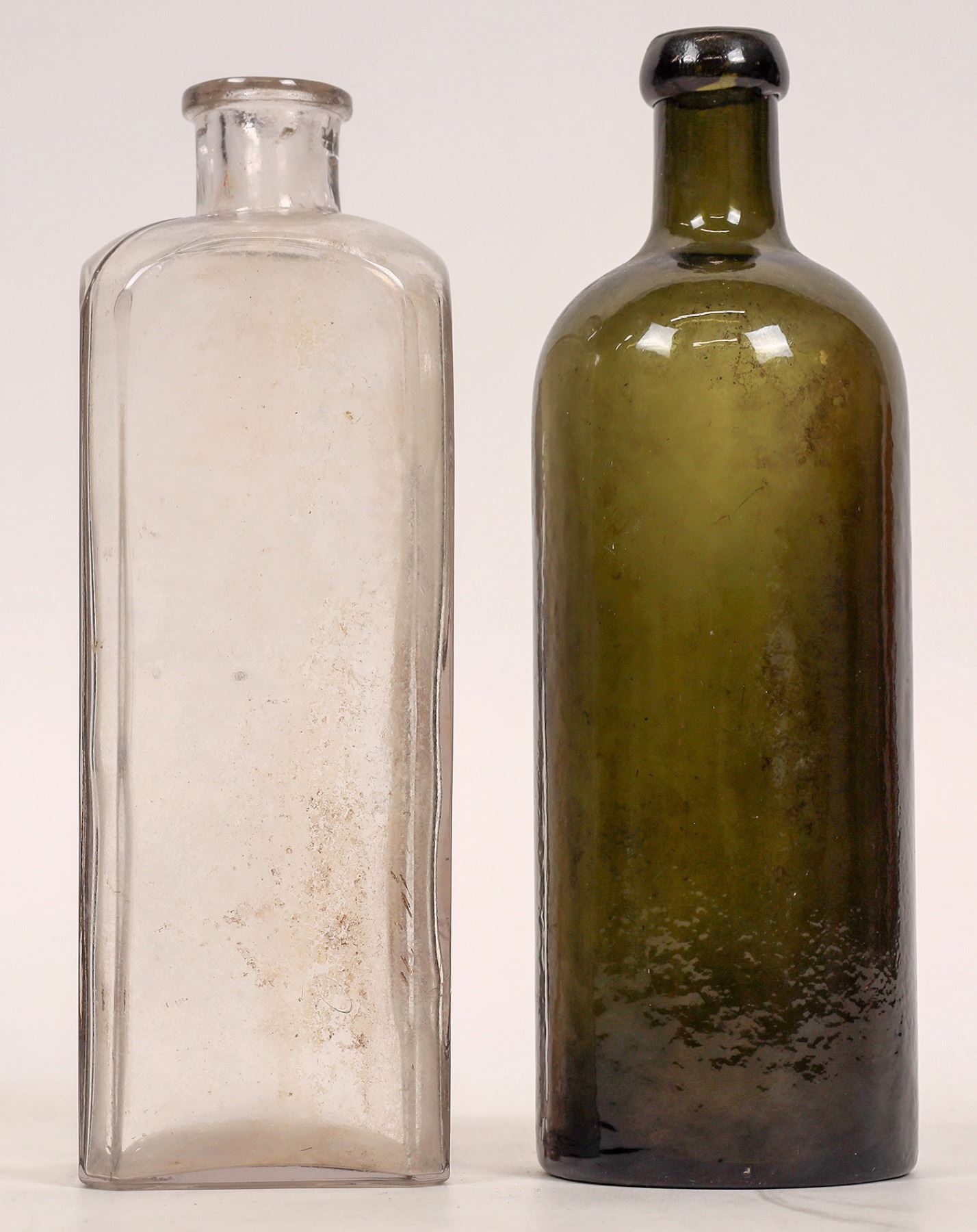 Clear Kennedy's/East India Bitters/Iler & Co/Omaha Neb, Ring-Ham K-26, 9"-molding issue on front above Iler, not a crack. Dark green Hunyard Janos 9.25", no apparent chips or cracks.