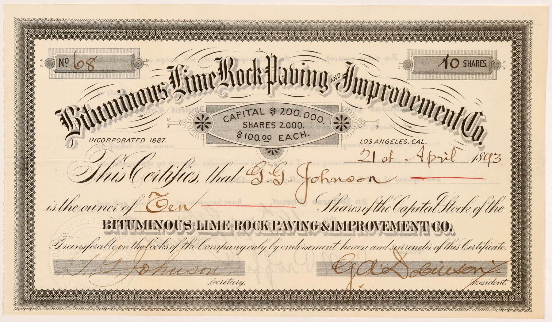 Inc. 1887. No. 68, issued for ten shares to secretary G.G. Johnson on April 21st, 1893 in Los Angeles. Signed by Johnson and also president G.A. Dobinson. Not cancelled. Black border and print, ornate logo. No printer listed. 6 x 10.25" Folds. Newspaper articles of the period highlight a paving contract the company was awarded for Main Street and Spring Street in Los Angeles. An 1888 LA Times article from the company says they have laid down 500,000 sq. ft. of bituminous lime rock pavement in Los Angeles. State: California City: Los Angeles Date: 1893