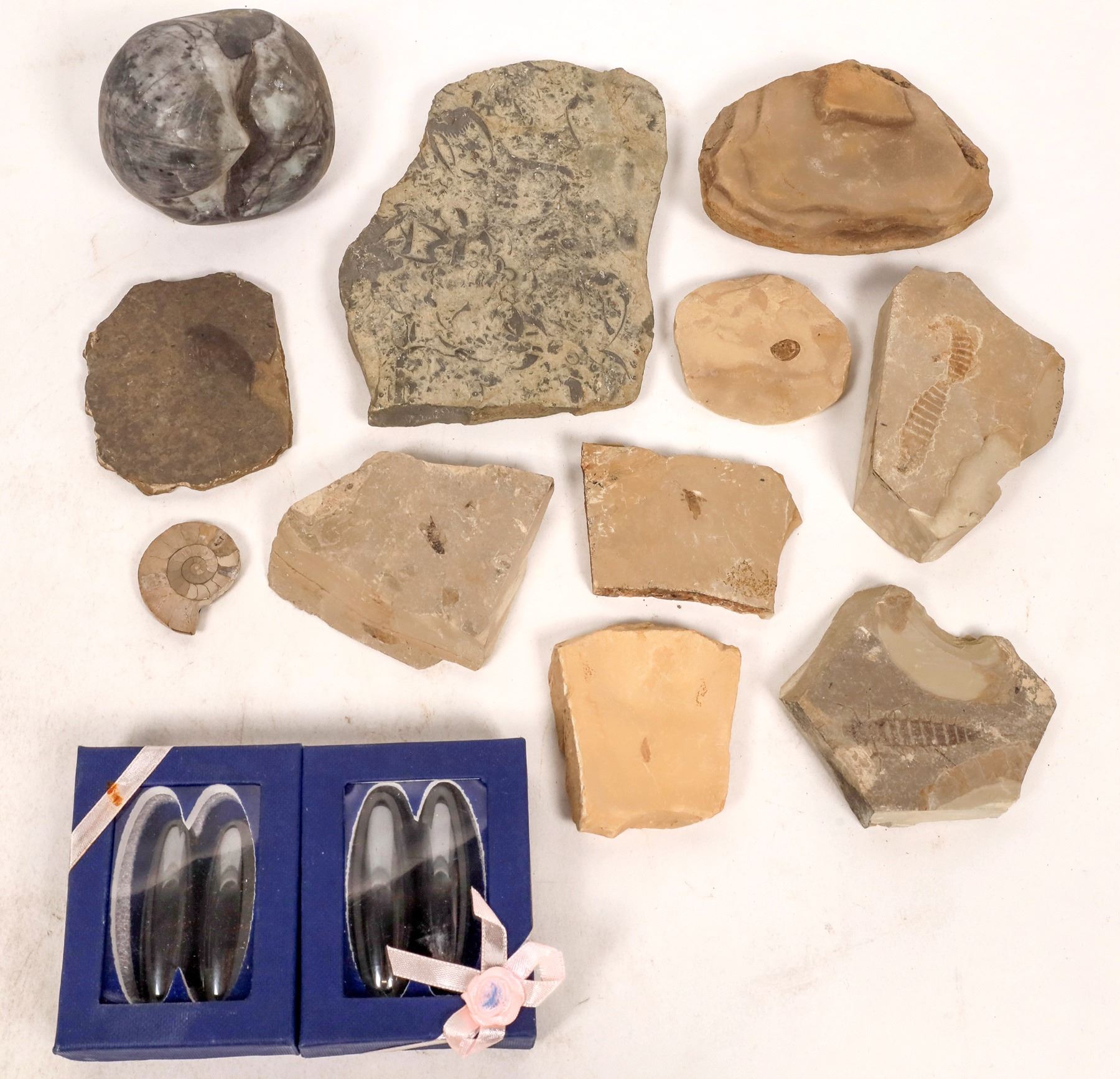 Lot of 13. Two boxes of magnitite, one bivalve, oh fossilized shell and insect fossils largest 5x4x1Ó China Chunlin Zhu Collection
