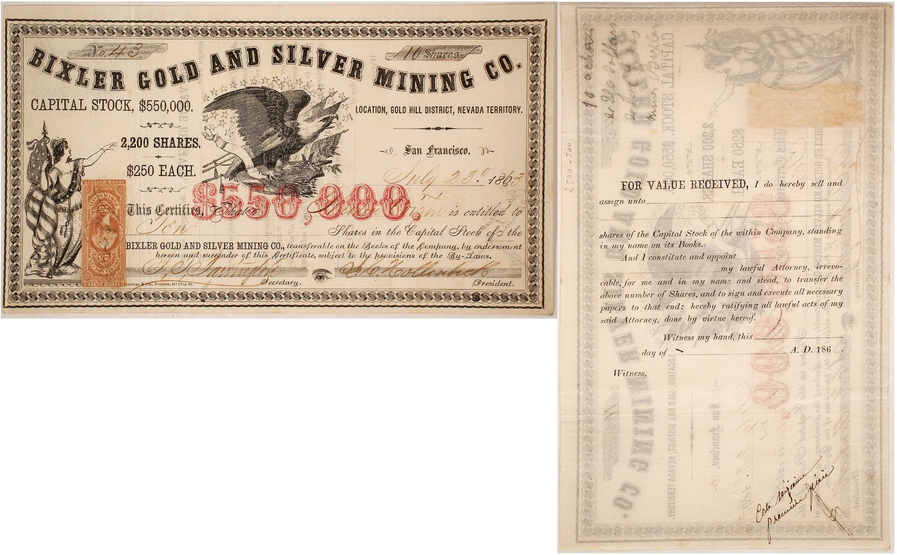 Location printed below logo: Gold Hill District, Nevada Territory. (It is not common to see "Nevada Territory" spelled out. Usually just N.T.) No. 43, issued for 10 shares to Theodore Voizin on July 23rd, 1863 in San Francisco. Signed by president J.C. Hollenbeck and the company secretary, I.C. Tarrington (?). Not cancelled. Large vignette of an eagle with other patriotic imagery. Also a vignette of an allegorical woman holding an American flag. Robbins & Co., Printers, SF. 25 cent Power of Attorney stamp attached upside down. Folds, some toning and writing on reverse. Not in Filer. Not listed in the Collins 1864 Comstock Directory. Hollenbeck is listed as a wholesale grocer in the 1864 Langley SF Directory. Theodore Voizin is listed with Voizin, Ris & Co. auctioneers and commission merchants. No listing of this mining company in the 1863 or 1864 Langley SF directories. No other references could be located.