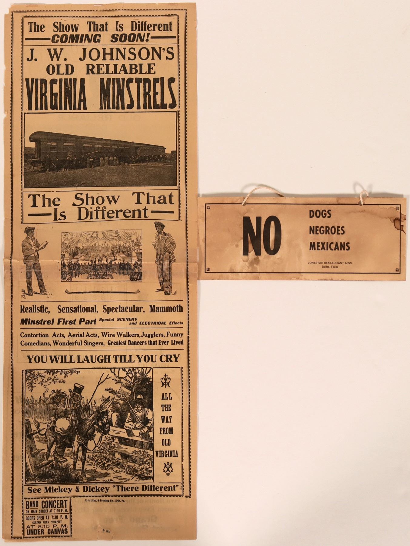 Lot of two. 1) J. W. Johnson's 'Old Reliable' Virginia Minstrels. Example of stereotyping based on race, yet definitely part of American hsitory. 2) 28 x 10" on newsprint. 2) Sign distributed by the Lonestar Restaurant Association out of Dallas, Texas. "one side says closed. The other says "No Dogs, Negroes or Mexicans." Another Example of this authentic sign can be found in the library of congress here https://www.loc.gov/exhibits/civil-rights-act/segregation-era.html