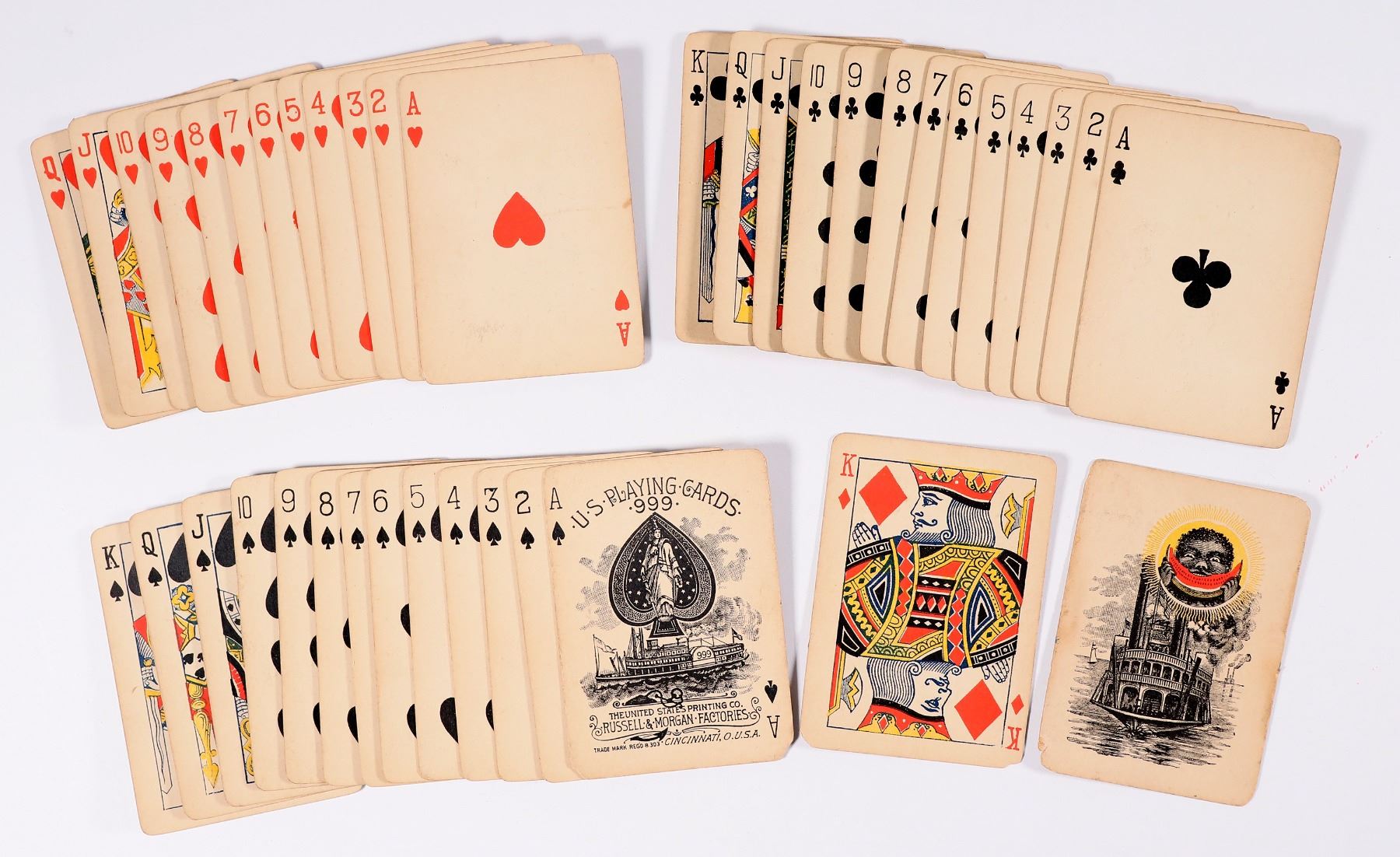 US Playing Cards Russell & Morgan Factories, partial deck with Black American watermelon wild card. A few playing cards missing, 3.5x2.5".