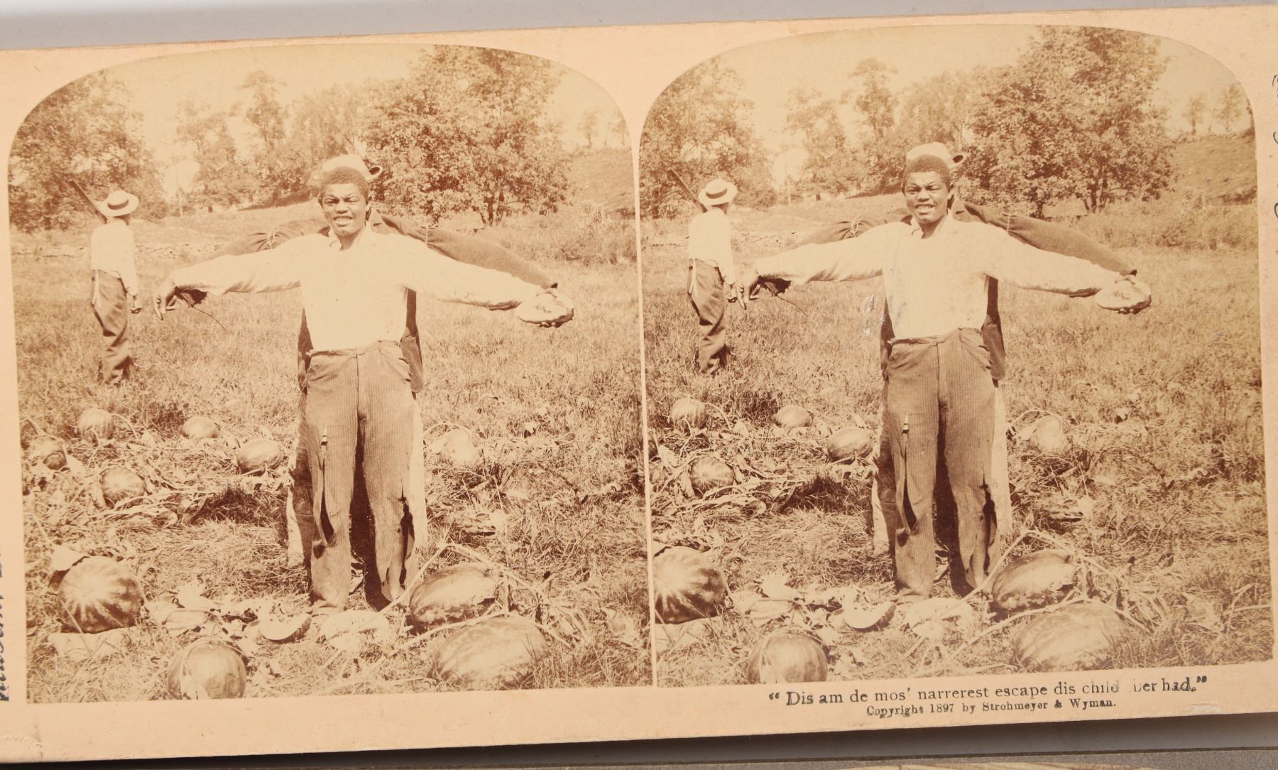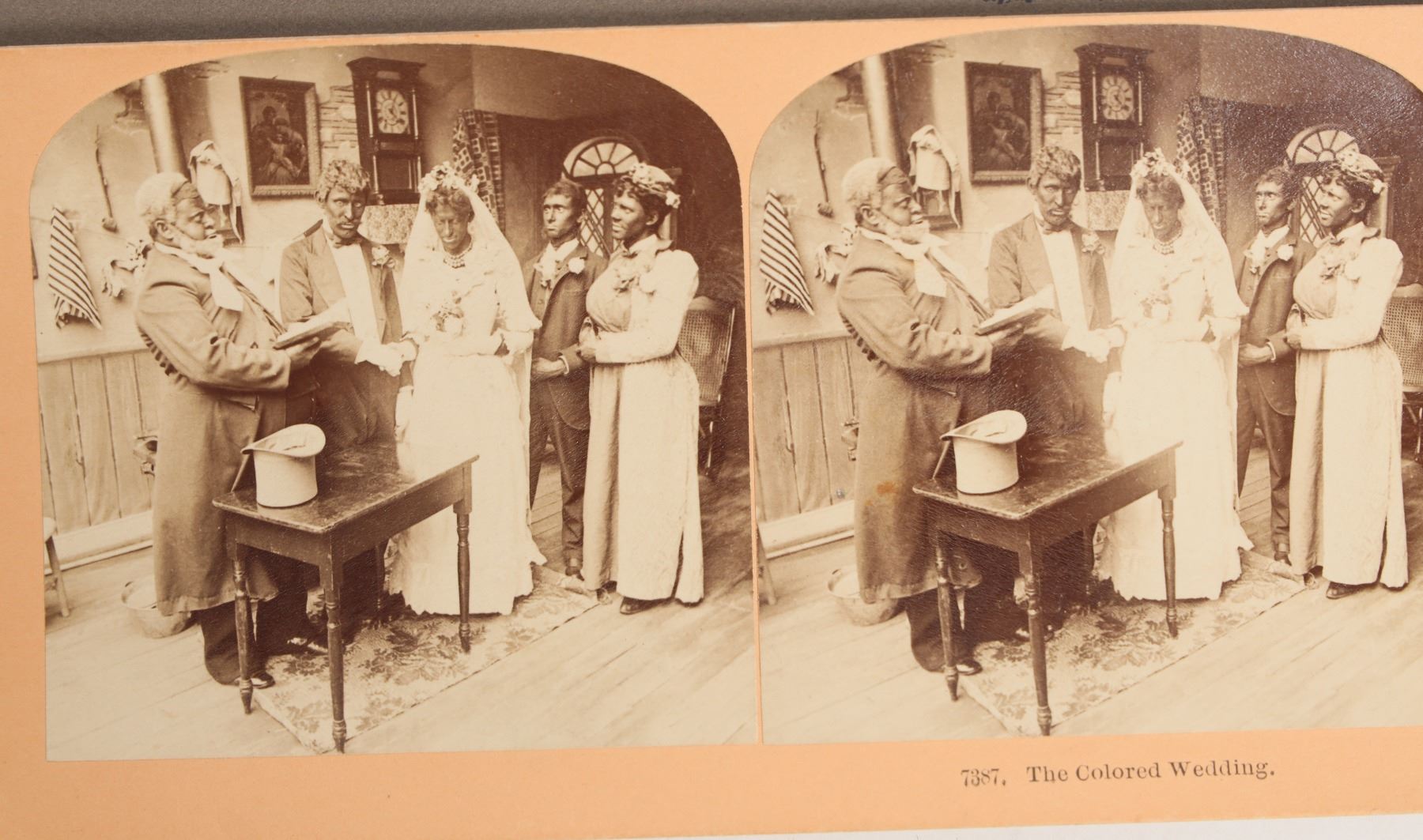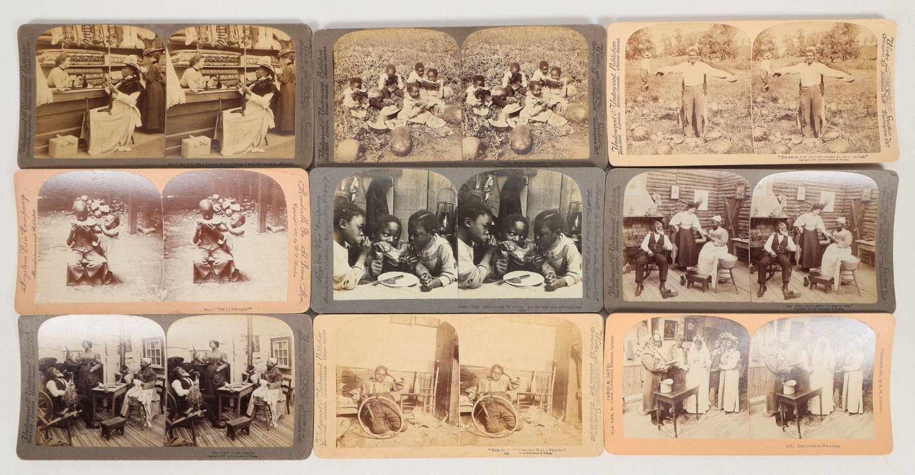 Lot of 9 different. These stereoviews feature staged scenes of black children and family life. They have racist captions written in gibberish meant to make the black subjects appear clueless. One stereoview is of a black-face wedding. Six Underwood & Underwood, two Keystone, and one Kilburn. A horrifying look at race relations in the US c.1890s-1900.