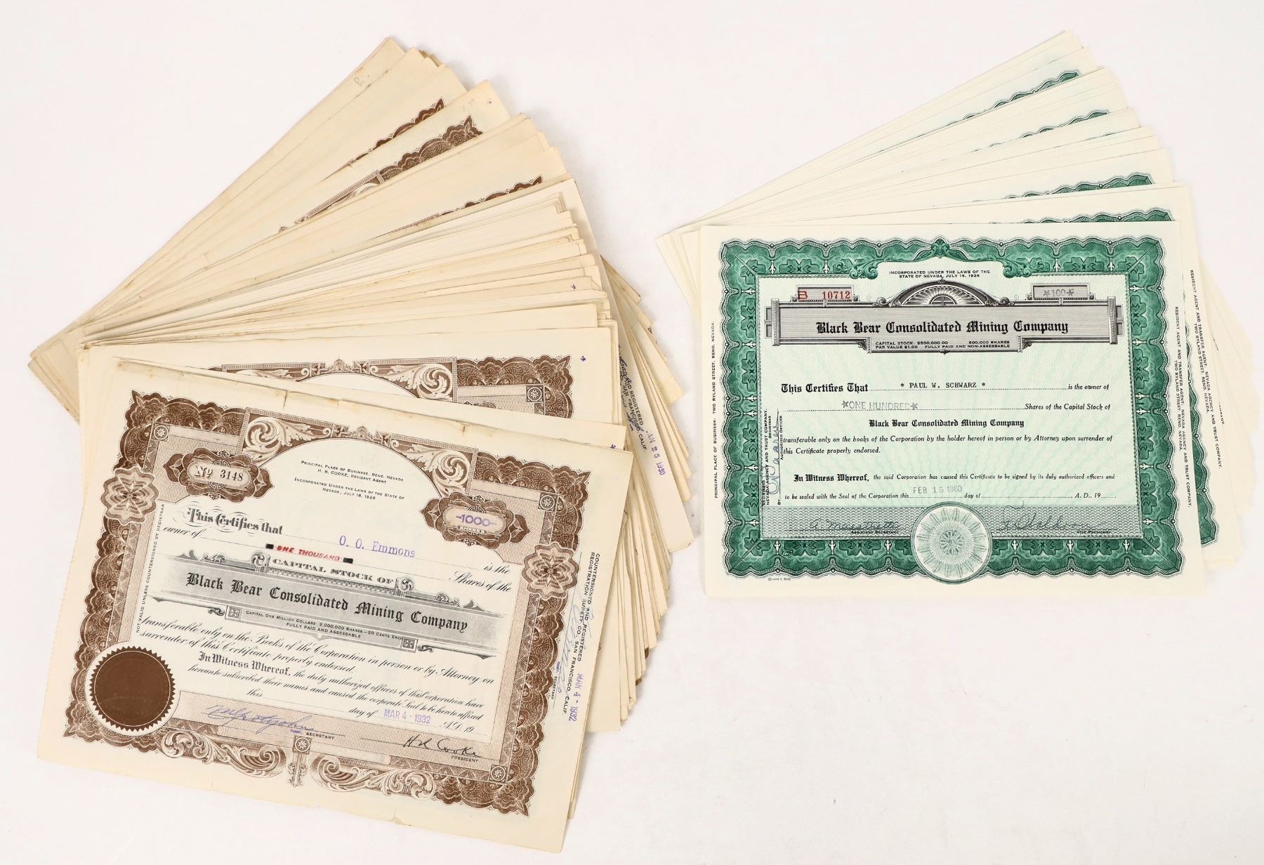 Silver Peak Mining District. Black Bear Consolidated Mining Co. Stocks c.1930s-60s About 150, issued, 2 varieties-1930s are brown and 1960s are green.