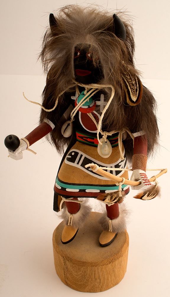 Black Buffalo by Seymore Lomakema. 9.5" h x 4.5" w x 4" d. Buffalo horns and wig removable. State:Arizona City:Hopi Date: ID# 49359