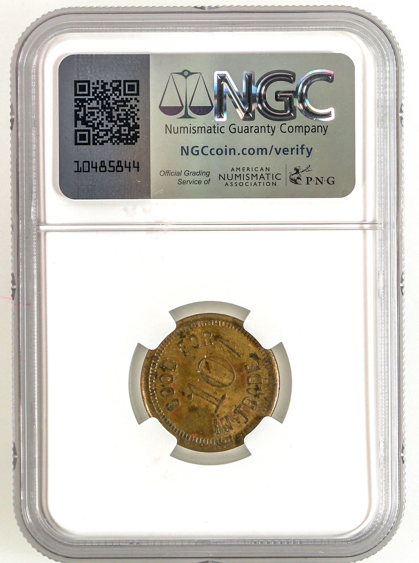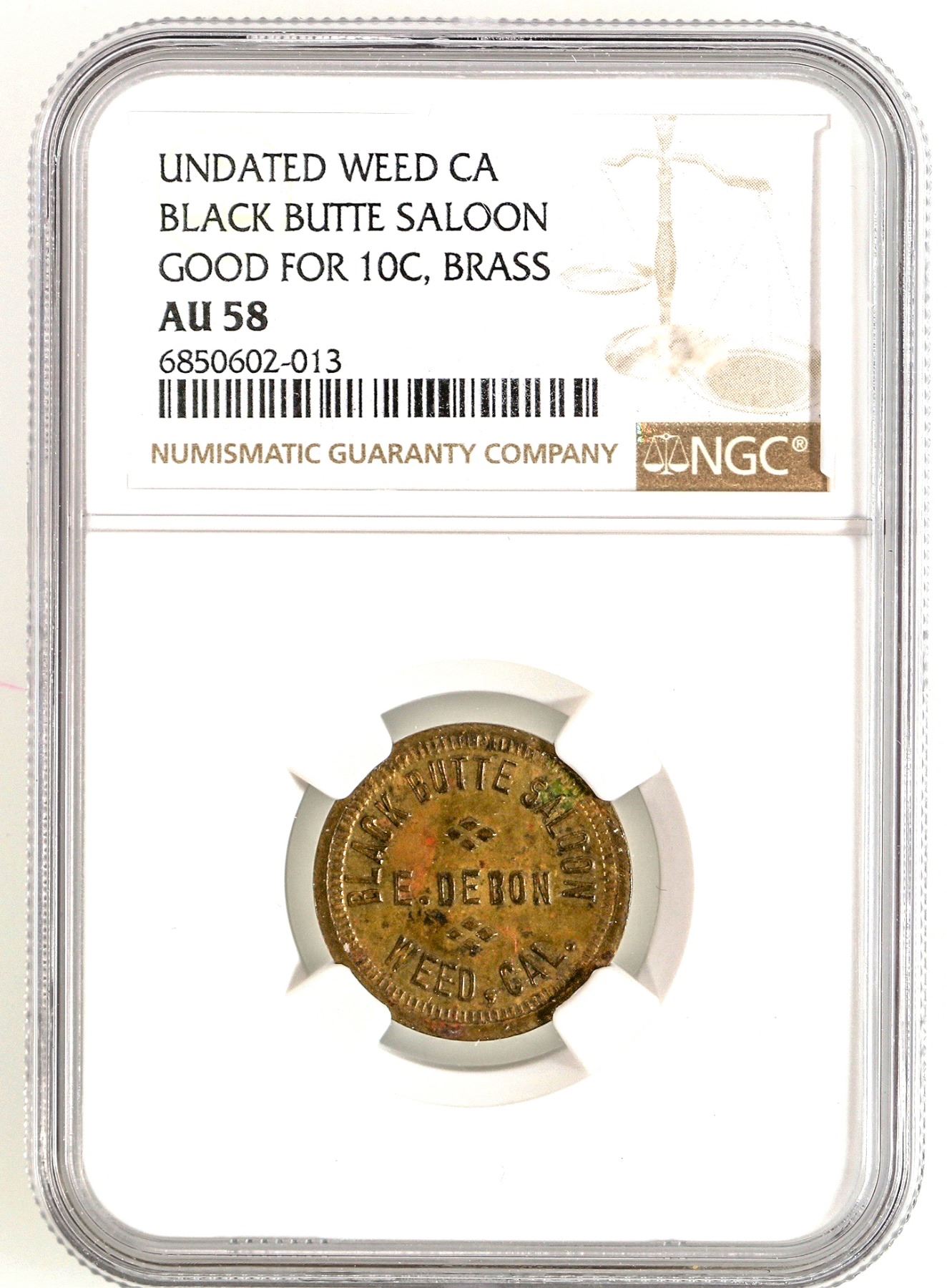 Extremely rare in NGC certified AU 58 condition! BLACK BUTTE SALOON / E. DEBON / WEED, CAL. // GOOD FOR / 10c / IN TRADE; Br., rd., 21 mm. Built in 1917 by Georgia Clark, a well-known local madam, served as a house of prostitution until the 1950s.