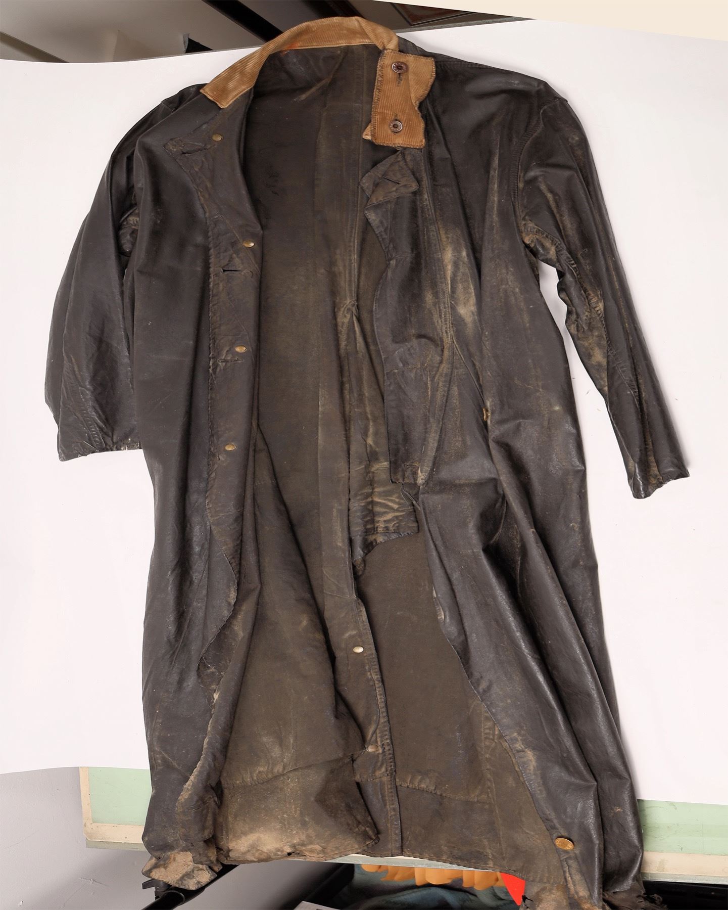 Original black cowboy rain slicker, as would be used by a cowboy on a horse. Most slickers were yellow, so this one is unusual and earlier. c. 1870's. Found in Tombstone, AZ in a dump in early 1970's. Maker is Towers Fish Brand, Boston Mass. Model No. 51 Pommel Slicker. Size 42. Brown corduroy collar.