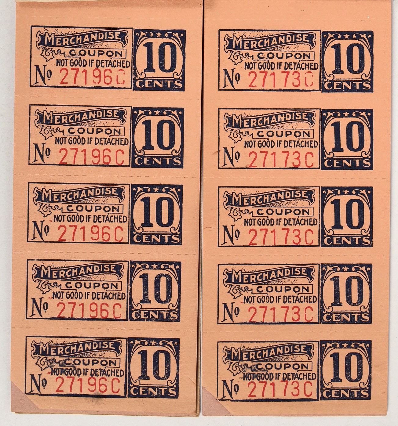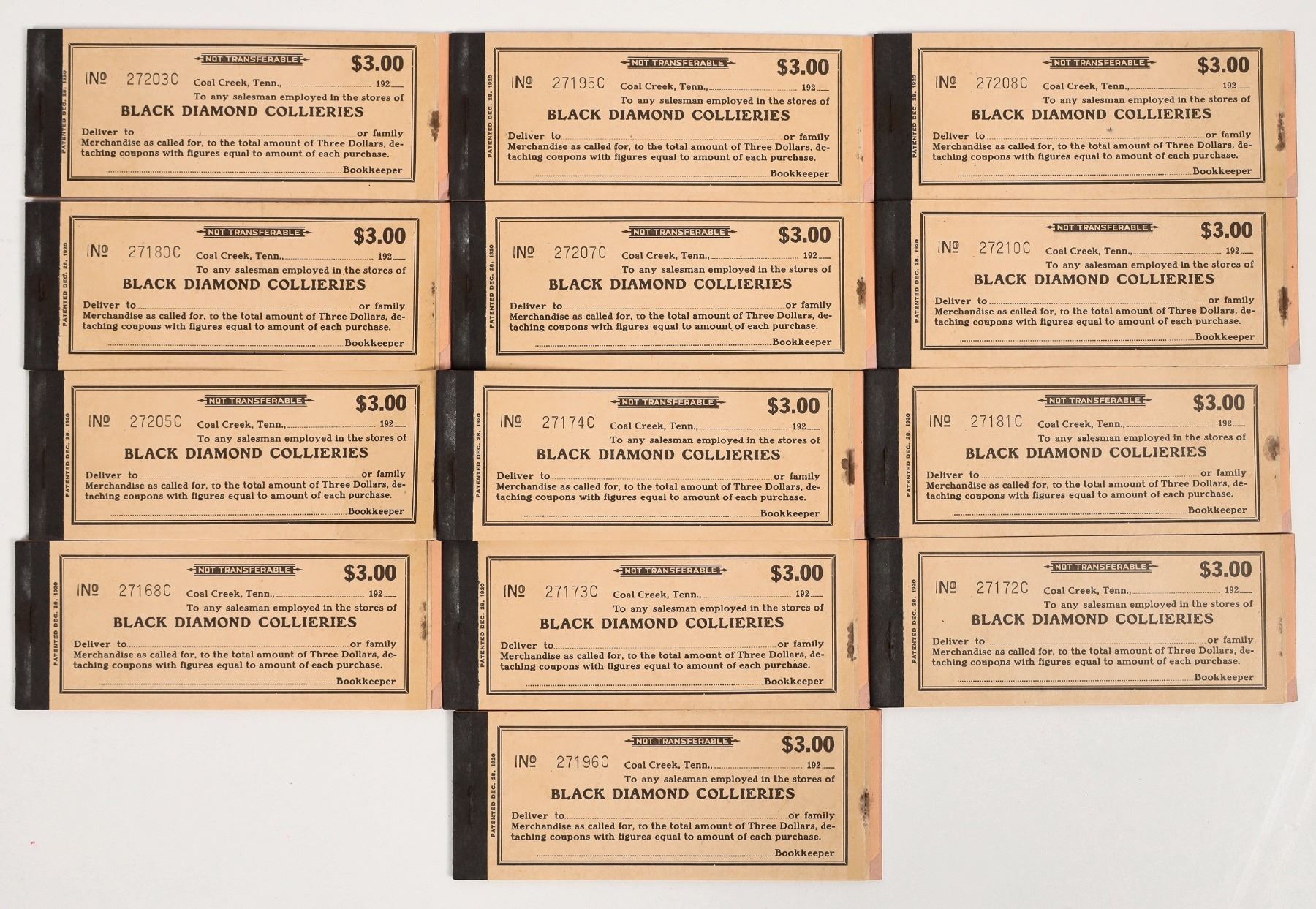 Coal mine scrip coupon books. Patented December 28, 1920, coupon books good for merchandise in the stores of Black Diamond Collieries. Each book good for $3.00. Scrip was a substitute for legal tender often used in coal towns, issued as wage or credit against the miner's next paycheck. Scrip could only be spent in company stores for goods (sold at a markup in isolated towns with weak labor unions) and were often a source of contention between workers and management. Each book 5 x 2 inches.