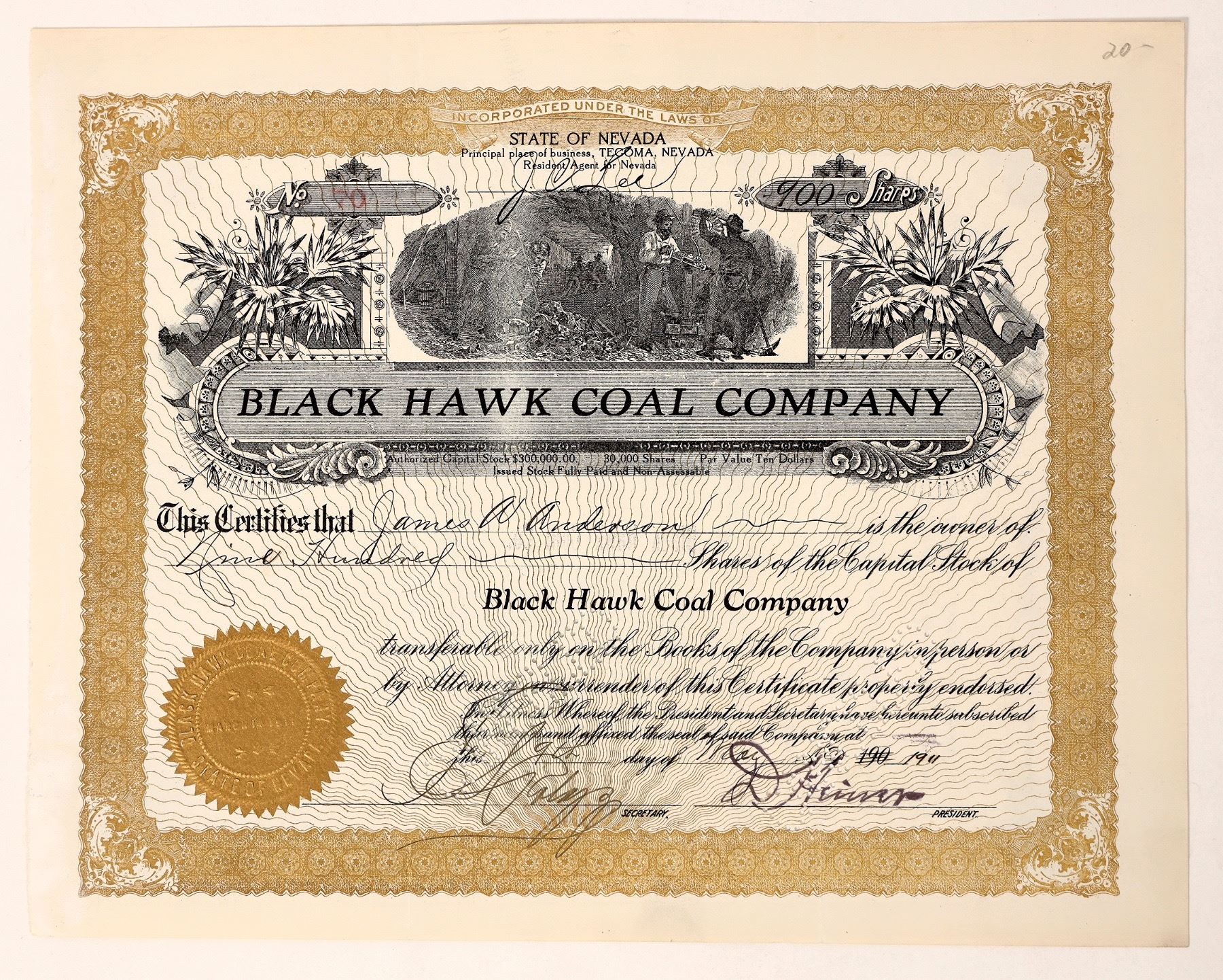 Rare issued 1911 Black Hawk Coal stock.[ Tecoma Nevada