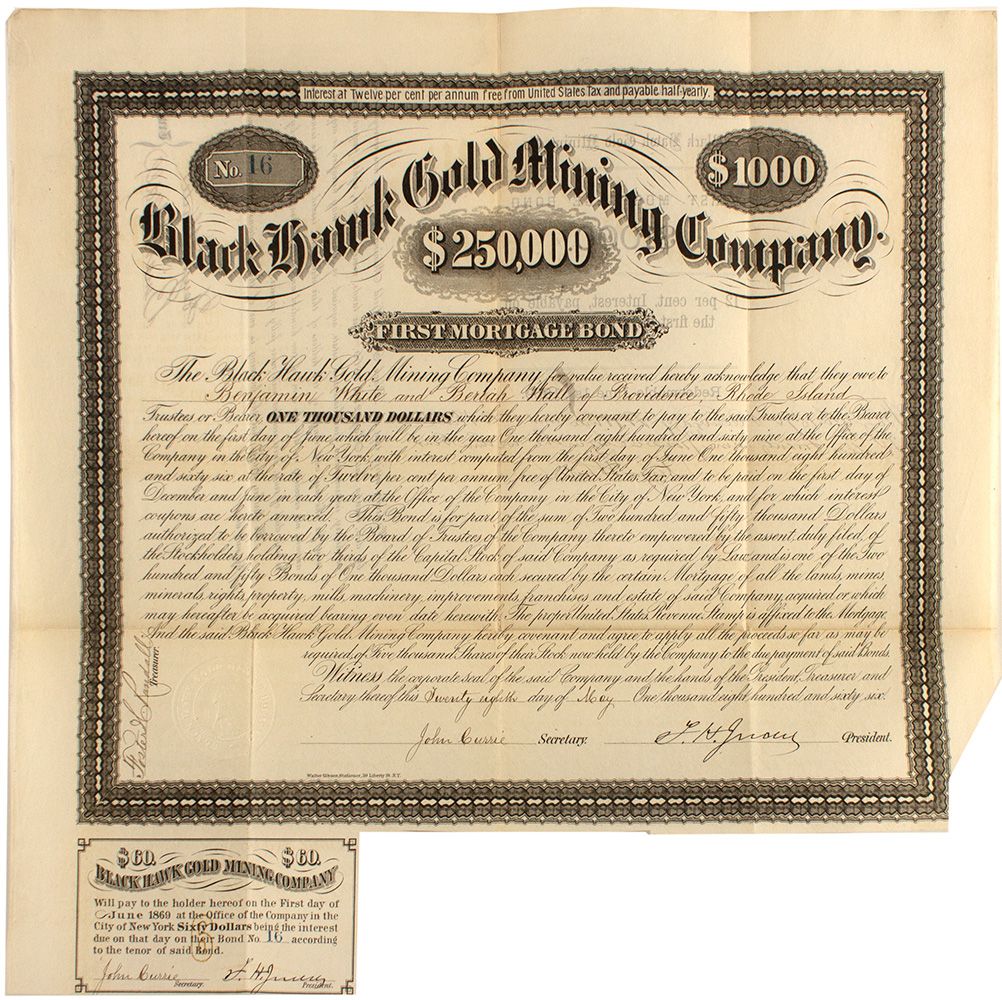 Rare, early Colorado company. Bond # 16. A $250,000 First Mortgage Bond issued to Benjamin White and Beriah Wall of Providence, RI. Twelve percent annum paid every six months. Approved May 28, 1866 in San Francisco. Signed by F.H. Jorry (?) as president and John Currie as secretary. Only 1 out of 30 $60 coupons dated June 1869 remains attached. Reverse is signed by White and Wall, and includes an 1875 notation of $29 received on bond. Printed by Walter Gibson, Stationer, 59 Liberty St., N.Y. Mines were located in Black Hawk, Colorado Territory on the Gregory Lode. Incorporated in 1864. A survey of the properties was issued by Professor Denton in 1865 and another report, by Colonel Crosby, Nov. 1865. Condition: fold lines, portion of bottom right border missing.City: Black HawkCounty: GilpinState: CODate: 1866