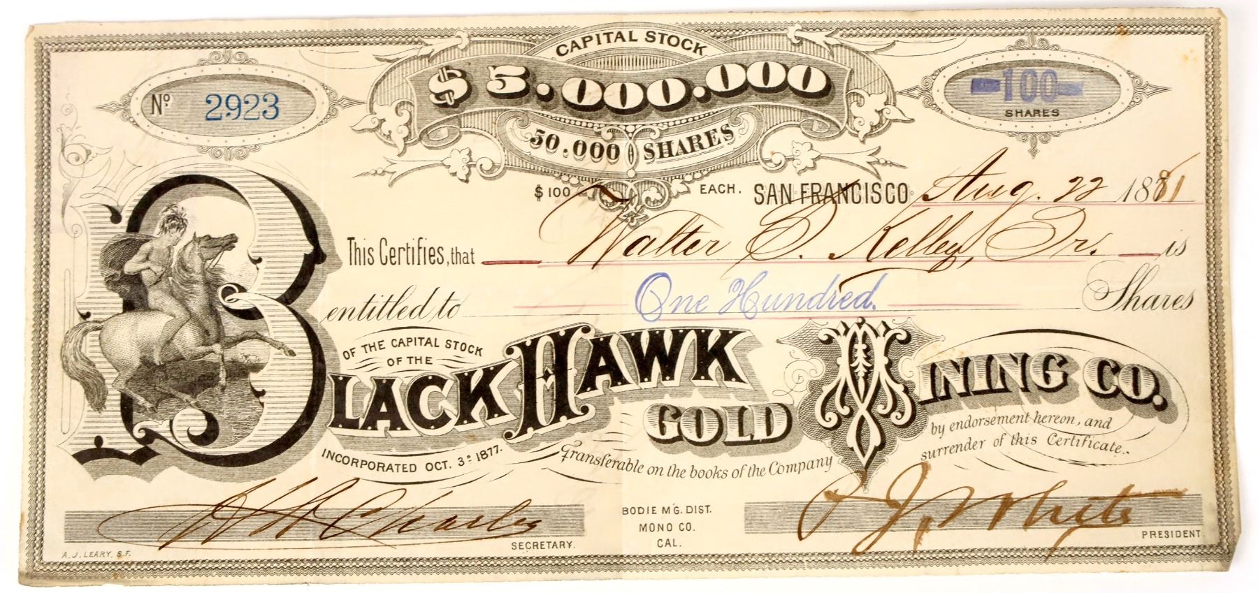 Black Hawk Gold Mining Co. Stock Certificate, Bodie, 1881 [198149]