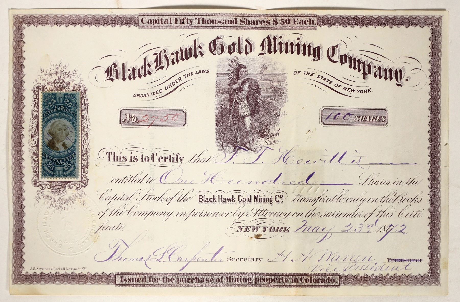 Very rare. Issued for the purchase of Mining property in Colorado. No. 2750, issued for 100 shares to FT Hewitt in May 1872, New York. Signed by vice president HA Warren and secretary Thomas Carpenter. Not cancelled. Purple print and vignette of Chief Black Hawk. 25 cent US IR stamp attached at left. Folds, light stains. 6.5 x 10" This company was established by WL Lee, who came to the area during the Gregory Gulch Rush of 1859. His company, Lee, Judd & Lee, named and developed the settlement of Blackhawk, Colorado, an ode to legendary Chief Black Hawk from Lee's native state of Illinois. This mining company owned and operated the Gregory, Foot & Simmons, and Gregory Extension mines near the original Gregory Lode by North Clear Creek. We have sold bonds for this company, but have no records of selling this stock.
