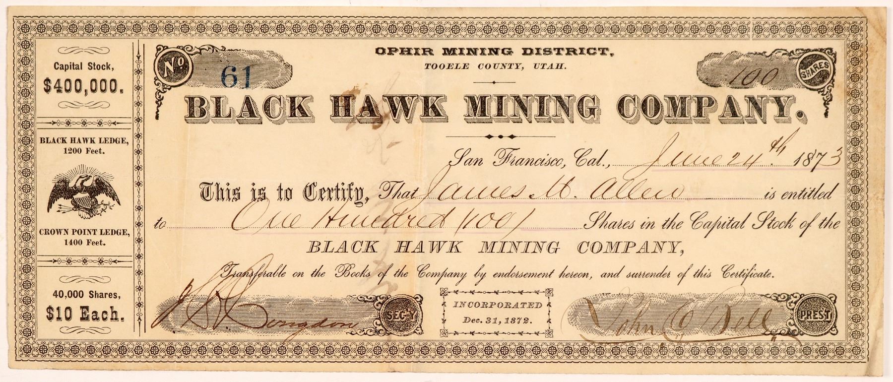 Ophir Mining District, Tooele County, Utah (printed at top center). Inc. Dec. 31st, 1872. No. 61, issued for 10 0shares to James M. Allen on June 24th, 1873 in San Francisco. Signed by president John Bell and secretary Congdon. Not cancelled. Ornate black border and print, small eagle vignette. Heavy folds, toning, some soiling. 4 x 9.5" The company claims are printed on the left side of the stock: Black Hawk Ledge, 1200 feet, and Crown Point Ledge, 1400 feet. Not listed in Filer or Holabird indexes. Ken Prag Collection