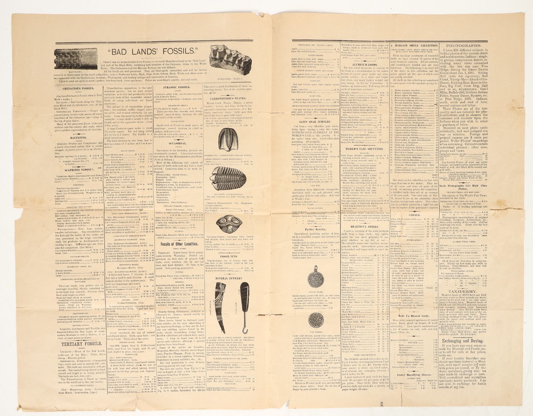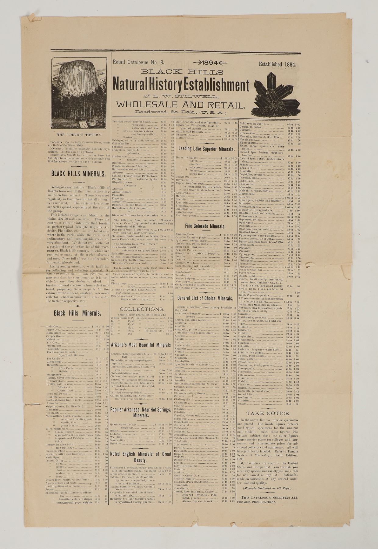 1894 Black Hills Natural History Establishment of L.W. Stillwell Deadwood South Dakota Souvenir Catalog. Newspaper style listing the store inventory of Indian relics, fossils, agate jewelry and more. Very good condition with small separation at the fold line.