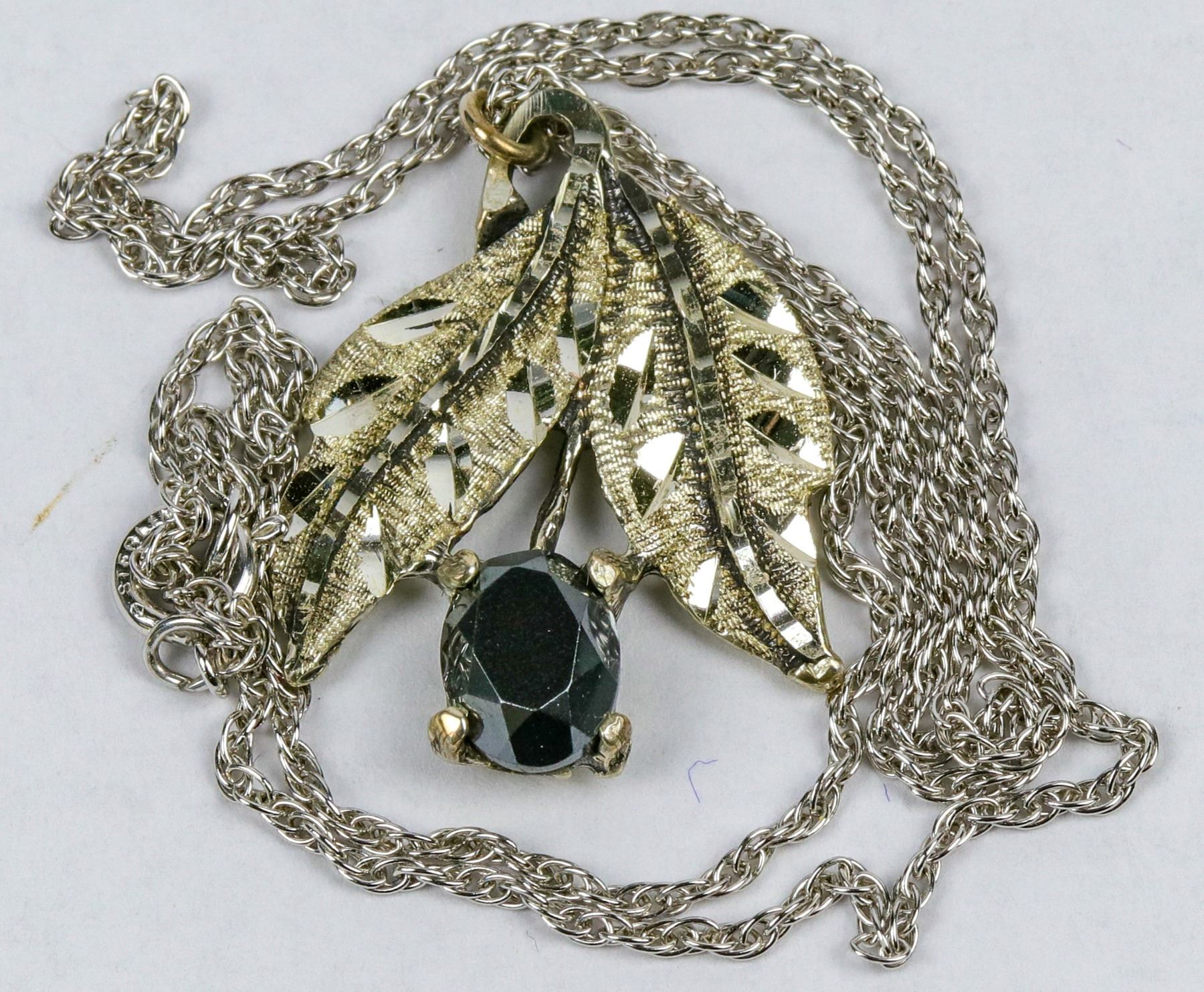 Original Langers Black Hills silver leaves with oval cut hematite stone. Elegant! Jim Langer began designing Black Hill silver in 1974. Pendant is 1" x .75" on a 17" silver chain.