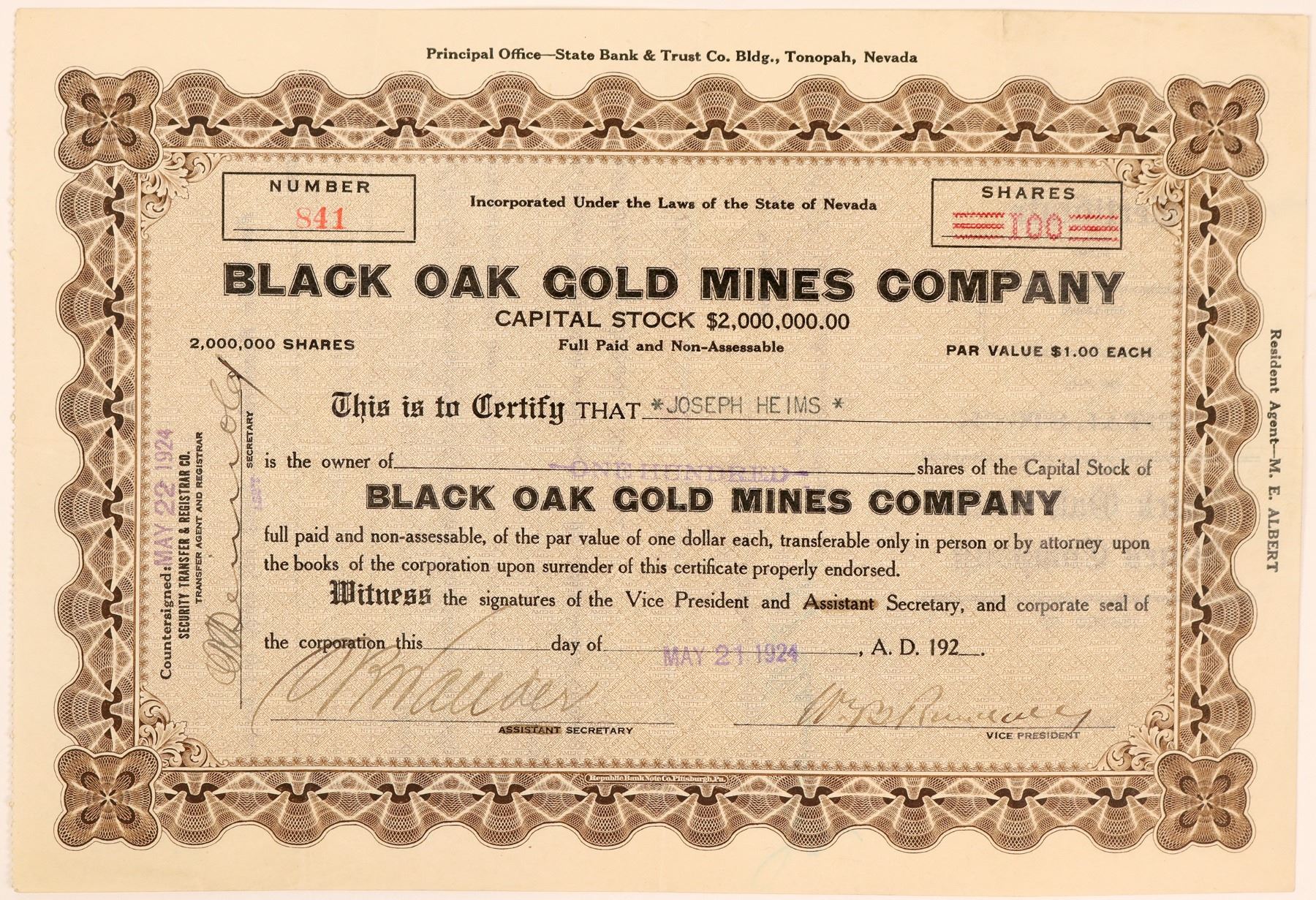 Issued in 1924. Mines was located 1 mile west of Soulsbyville. Presumably incorporated to take over Black Oak Mining and Milling Company (1924 Mines Handbook). Folds. Uncancelled.
