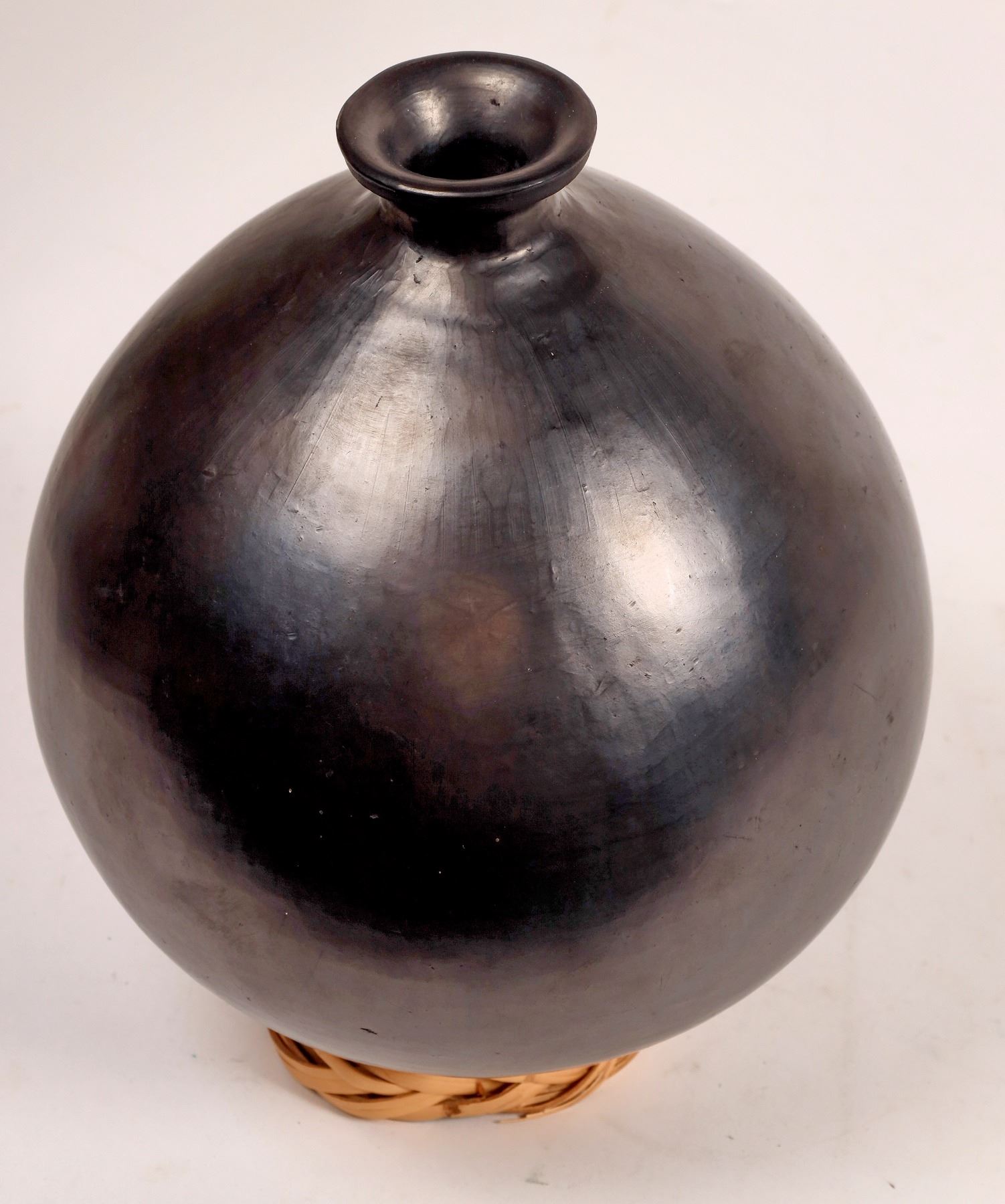 Black pot signed by Ernestine Galan. 9.5x8.25". Lip wear, no apparent cracks or chips.