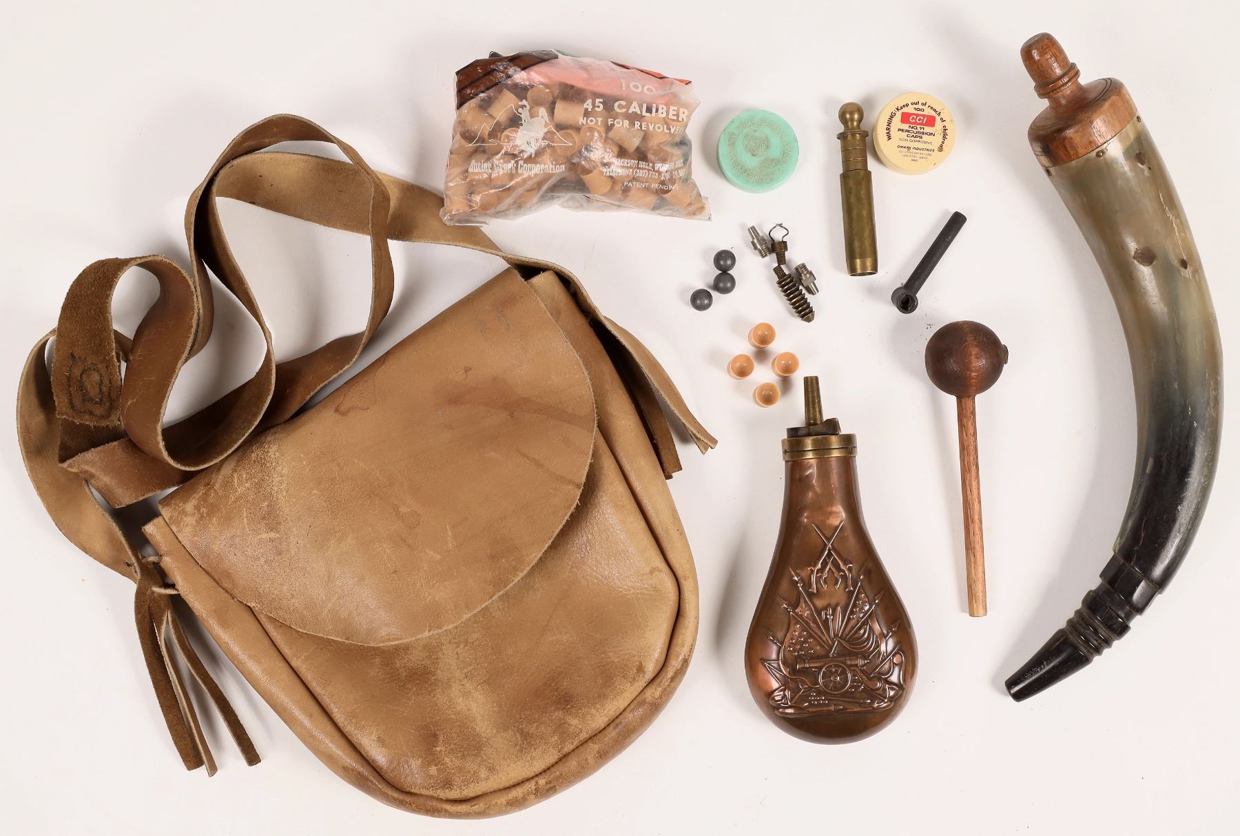 This possibles bag contains a powder flask, powder horn, nipple wrench, adjustable powder measure, two open tins of percussion caps size #10 Navy Arms, size #11 Remington; about 50 round ball .45 cal. (.435 in.) , a bag of poly-patch sabots, two spare SS nipples and a cleaning jag size 10-24. Everything is here except the powder. Extra shipping fees apply. No international sales.