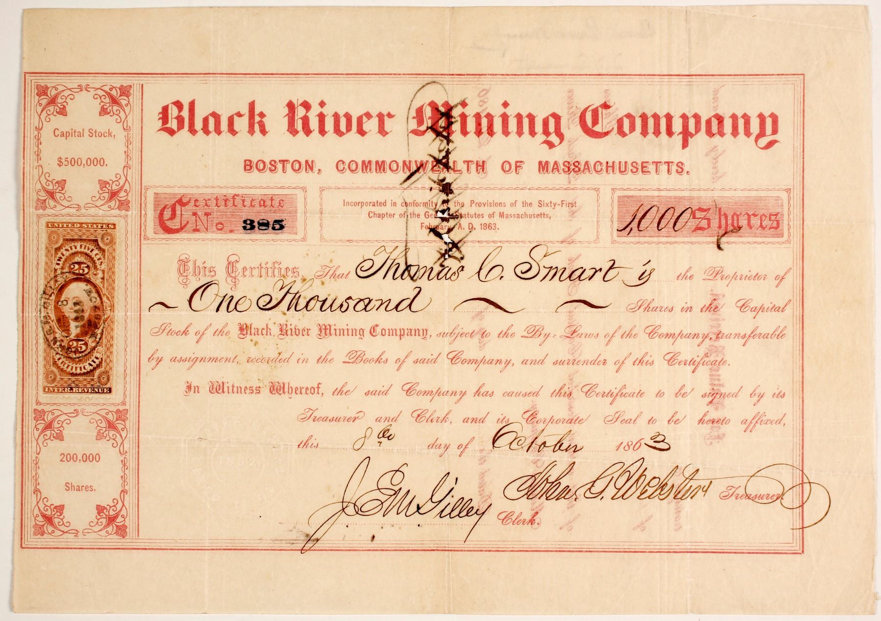# 385 for 1,000 shares to Thomas C Smart. Signed by president John G Webster and clerk JE Gilley. Incorporated in Massachusetts in 1863. Datelined 1863. 25c Certificate Revenue Stamp. Not cancelled. Holes where a name has been crossed out on the back. Nice!Most likely Michigan? Prag Collection City: State: Michigan Date: 1863 HWAC# 80461