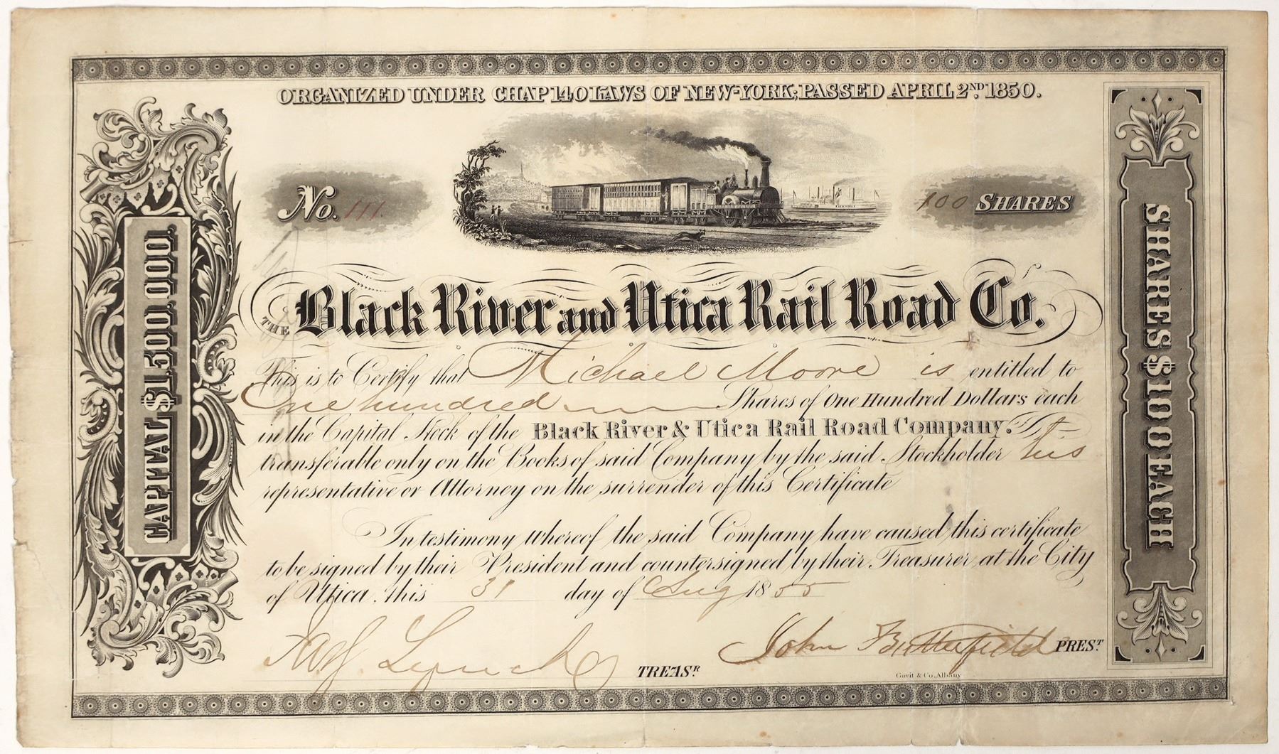 Organized April 1850. No. 111, issued to Richard Moore in Utica in 1855. Signed by John Butterfield as president and Lynch as treasurer. Not cancelled. Folds, creases, pinholes. 6.5 x 11" John Butterfield was an operator of stagecoach and freight lines in the 19th century in the American Northeast and Southwest. He founded companies that became American Express and Wells Fargo. Butterfield also founded the Butterfield Overland Express and from 1858 to 1861 operated a stage route running from St. Louis to San Francisco, connecting California to the growing nation.