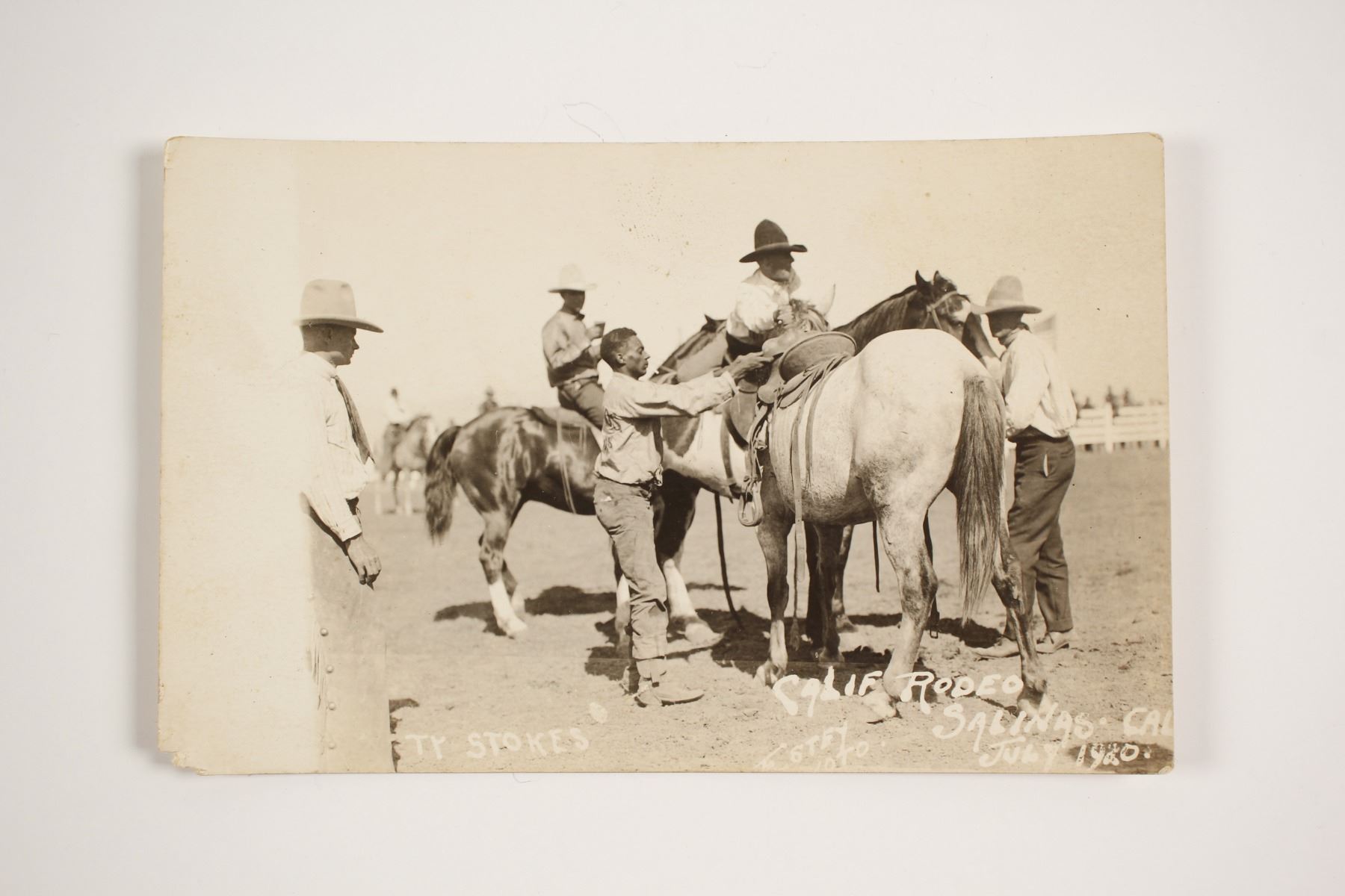 Real photo postcard, unwritten, showing "Ty Stokes" at a California rodeo in Salinas July 1920. Stokes and Jesse Stahl performed a "suicide ride" on bucking broncs back-to-back as entertainment in the 1920s.In April of 1929, Stokes died of a heart attack at the age of 44. The Hayward Daily Review reported his death under the headline, "Noted Figure of Wild West Shows Rides Last Steed." The paper describes Stokes as "one of the most noted of the Negro riders in wild west shows between Cheyenne and the Pacific Coast. It was said of him that he could ride anything on four legs." Salvatore Falcone Collection. State: California City: Salinas Date: 1920