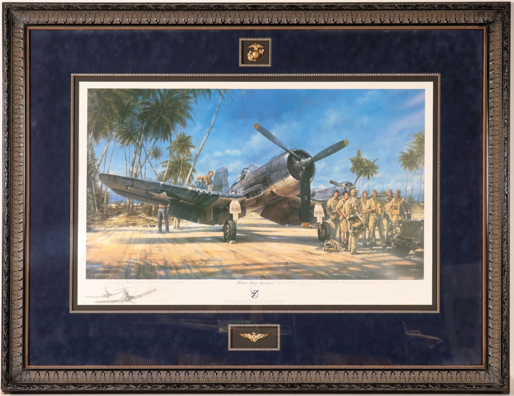 The print entitled "Black Sheep Squadron" by artist John D. Shaw depicts a home base debriefing at Vella Lavella in 1943. Beautifully double mattted in a navy blue suede and bead border. Overall 35 in. X 47 in. Signatures include John Bolt, Henry Bourgeois, Warren Emrich, Ed Harper, William Heier, James Hill, Harry Johnson, Perry Lane, Fred Losch, Al Marker, Bruce Matheson, and Ed Olander. The 1988 reunion did not include Greg "Pappy" Boyington who had passed earlier in the year. Includes two ensignias; one Navy and one Marine. This is your chance to own Marine Corp. history of the VMF-214 and their Corsairs.