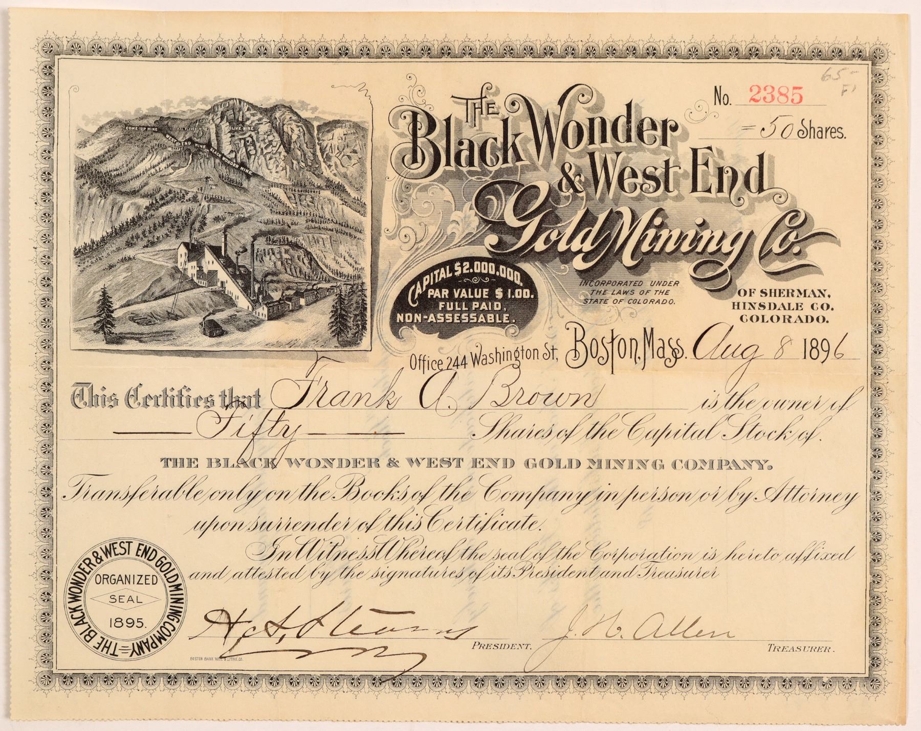 "of Sherman, Hinsdale Co., Colorado." Inc. in Colorado. No. 2385, issued for 50 shares to Frank A. Brown on Aug. 8th, 1896 in Boston. Signed by president H. Stears and treasurer JH Allen. Not cancelled. Black border and print, fancy logo, and highly detailed vignette of the mine with names labelled. Printed by Boston Bank Note Co. Pinholes, folds, toning on top half (more noticeable on reverse). 7 x 8.75" According to the 1898 CO Mining Directory, the company owned the Black Wonder and West End lodes. Development included 2000 ft. on the Black Wonder and 250 ft. on the West End. Their 30 stamp mill was connected to the mine with a tramway. Homer Harrington is supt. (pg. 250). Ken Prag Collection