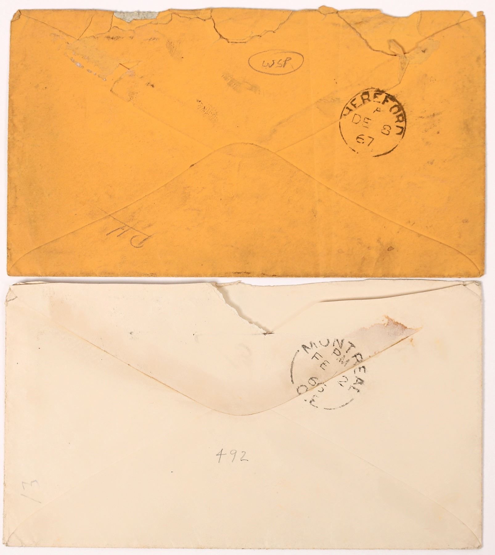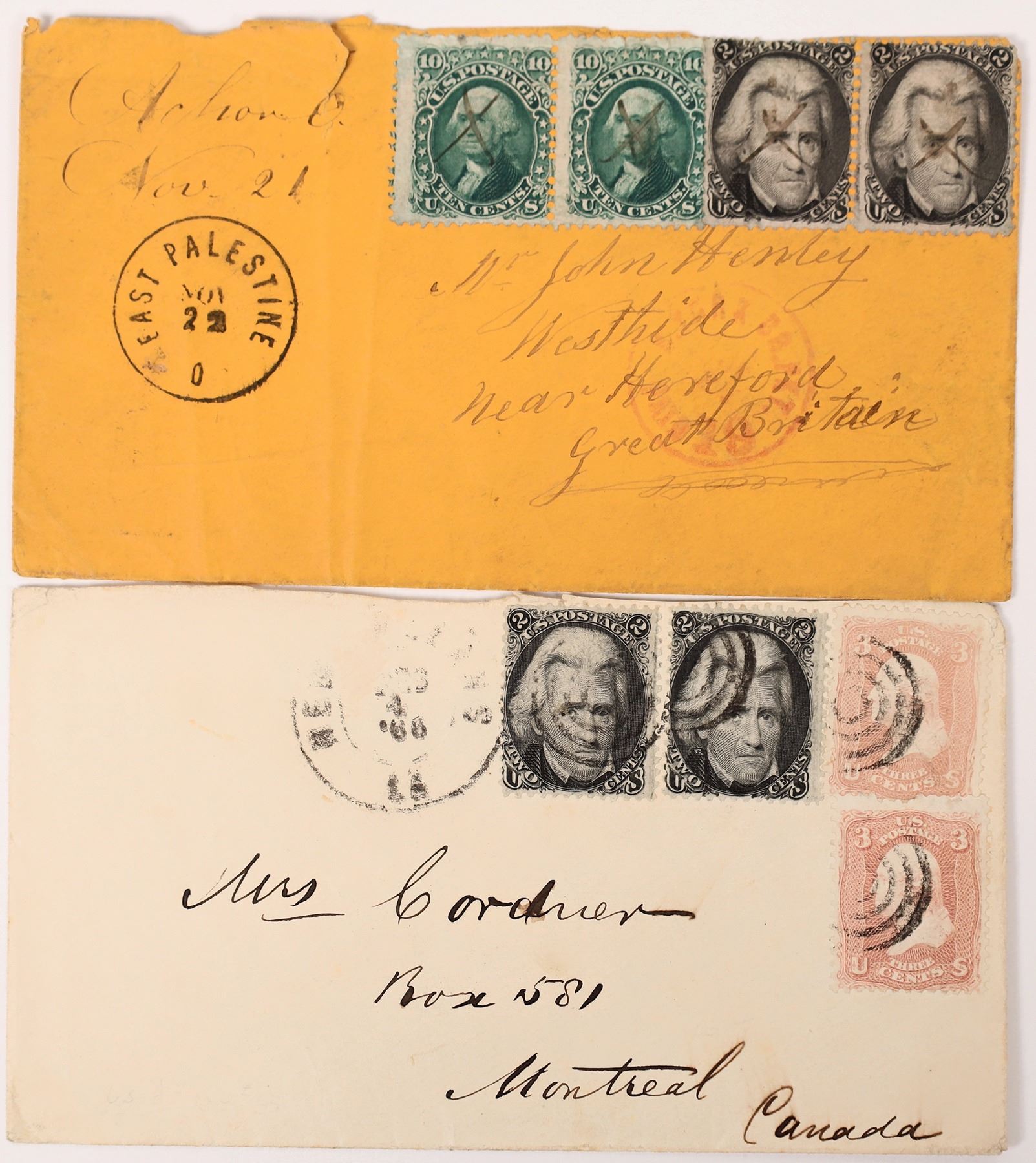 2 covers with A32 Blackjack pairs and 2 additional stamps. c. 1866-67. Yellow cover has hand cancels.