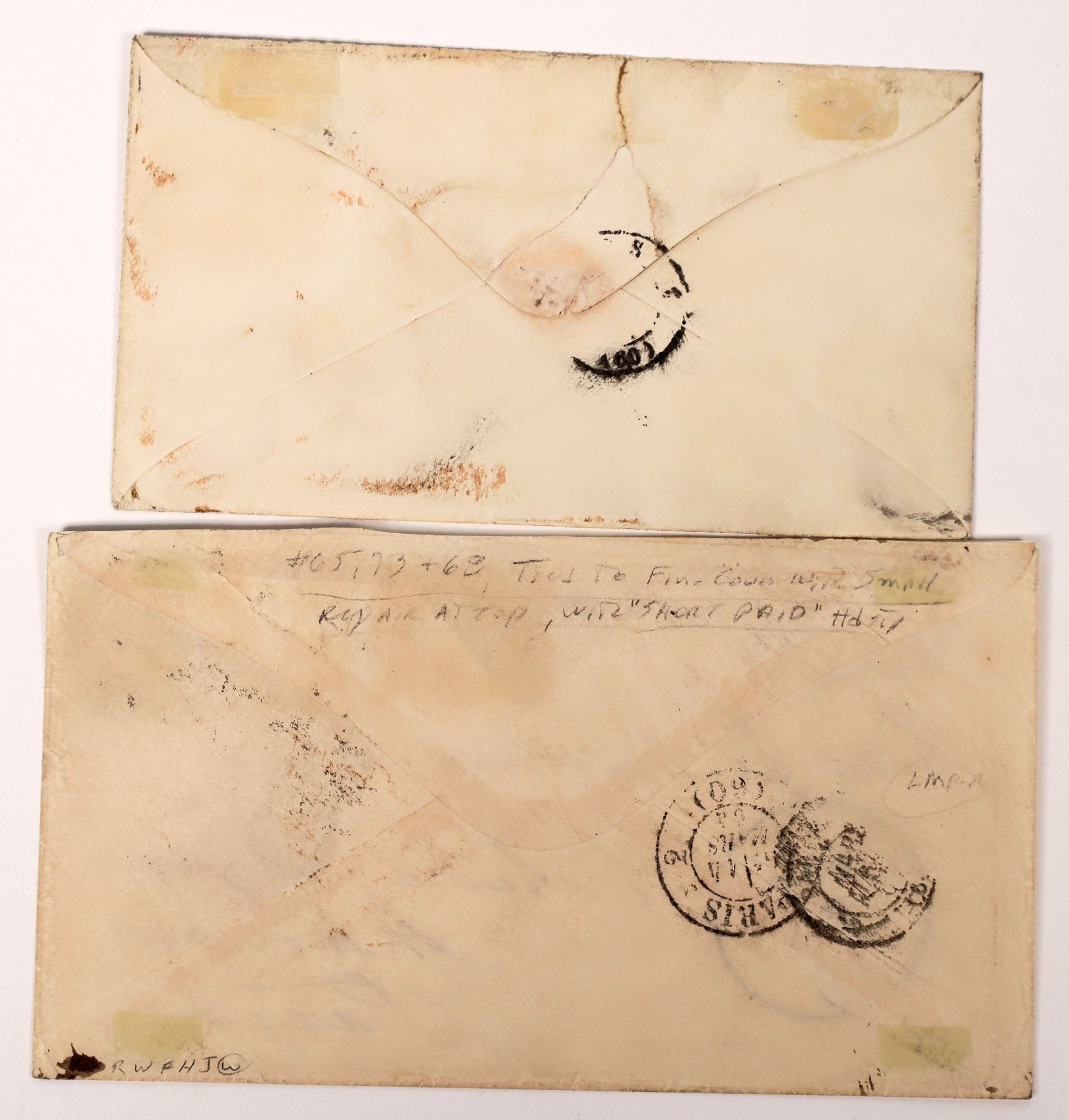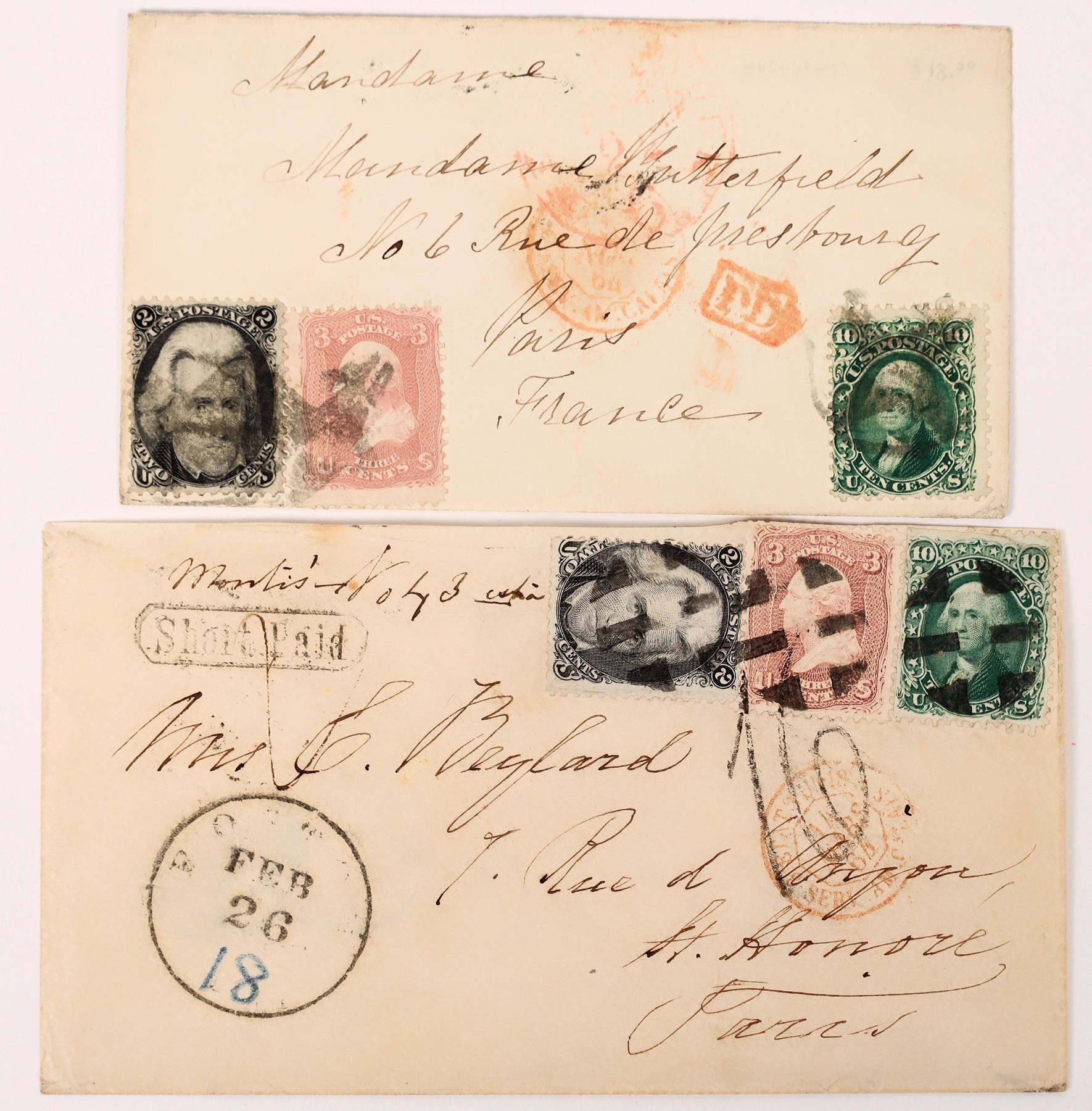 2 nice Blackjack trio covers. A25 and A27 with 3 and 10 cent added. Both addressed to Paris, France . One short paid, pencil writing on both.