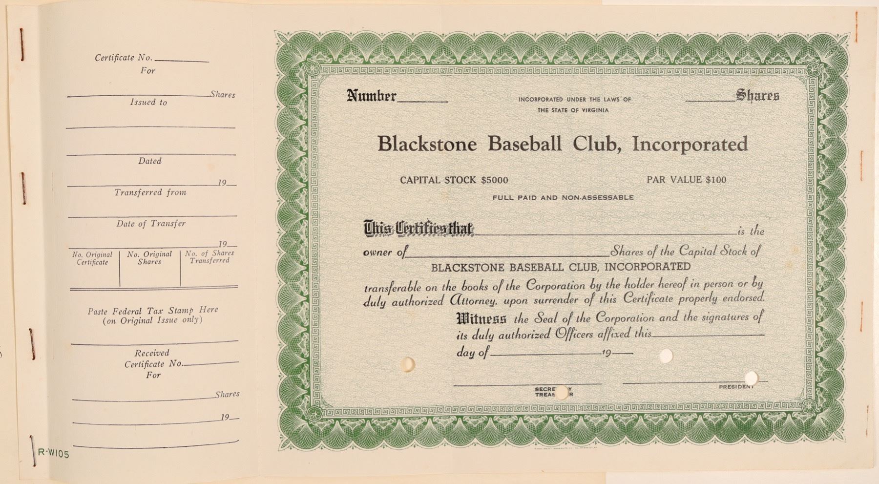 Specimen cert of the Blackstone Baseball Club. c1940's. One fold and discoloration where the stock was pressed against staples. Hole punched. Unique! State: Virginia City: Blackstone Date: c1940's