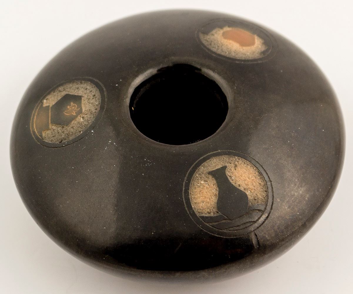 Blackware Jar by Tah-Moo-Whe (Barbara Gonzales. Black seed pot with three brown toned sgraffito images around top.1.75" h x 4" diameter. Barbara Gonzales (1947- ) Tahn Moo Whe, from San Ildefonso Pueblo, is an excellent potter and an extension of her famous great-grandmother, Maria Martinez, and her grandparents, Adam and Santana Martinez. Her mother, Anita Martinez, was also a potter. Drawing on the traditions of her family, she expanded this tradition by personalizing her pottery she describes as "slipped-designed polychrome" with inlaid coral and turquoise on etched black and sienna wares, often inlaid on spider designs which she created in 1973. “Barbara calls herself a clay artist rather than simply a potter. She has said, ‘As an artist, if you let yourself go, you will find yourself doing different things’ and, ‘Whenever an Indian gets involved with art, they do it with their whole being—that’s what makes the art unique.’ She has created some unique forms and styles, such as the spider and spider webbing technique in sgraffito that has become her trademark. She says the use of the spider on her pots symbolizes good luck.” (Reference: The Legacy of Maria Poveka Martinez by Richard Spivey)