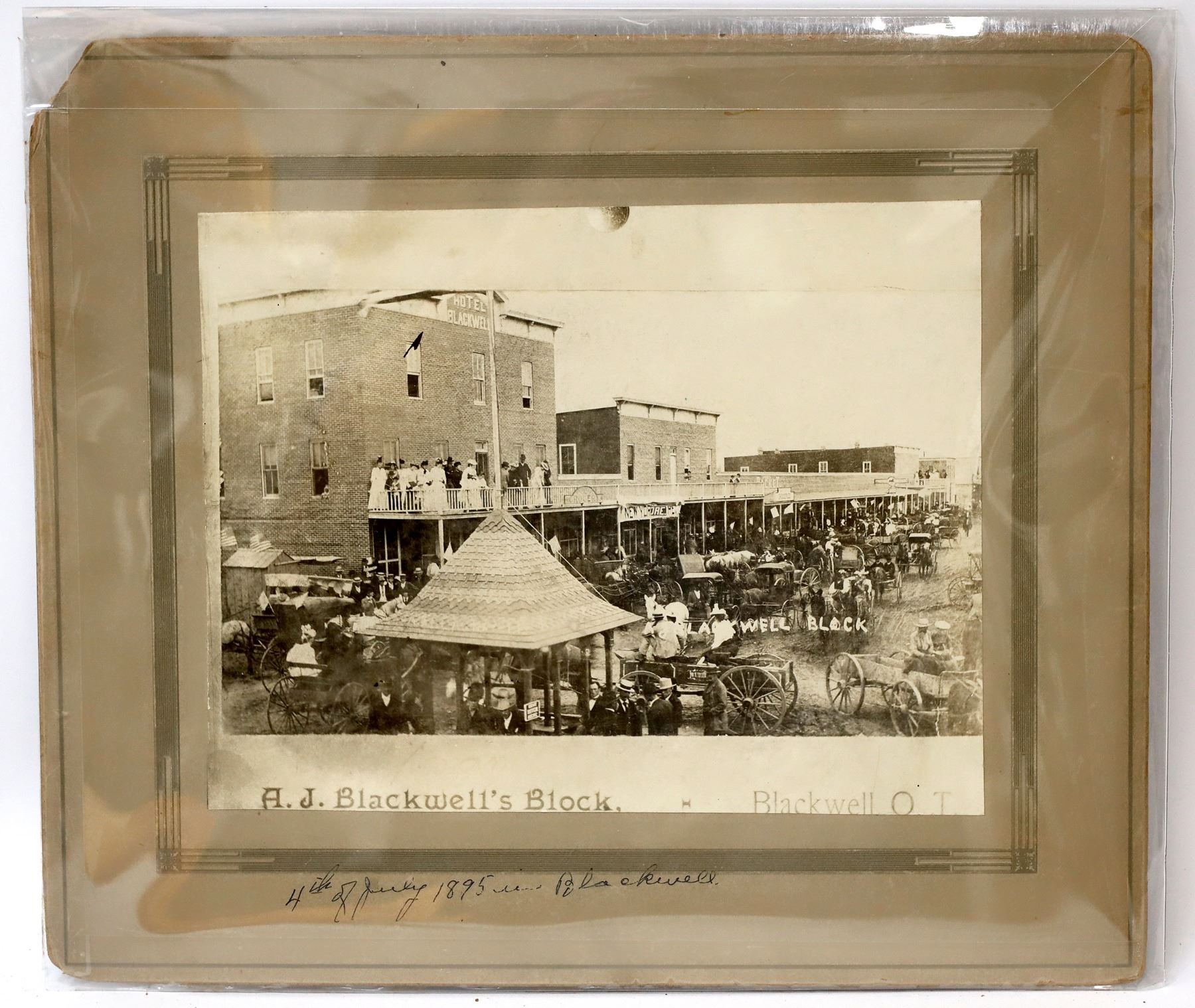 Photograph of a Fourth of July celebration in Blackwell, Oklahoma Territory in 1895. Specifically, this photo is a street view of A.J. Blackwell's Block. The Hotel Blackwell is at the forefront. Mounted photograph, 13.5 x 11.5 inches. Good condition.