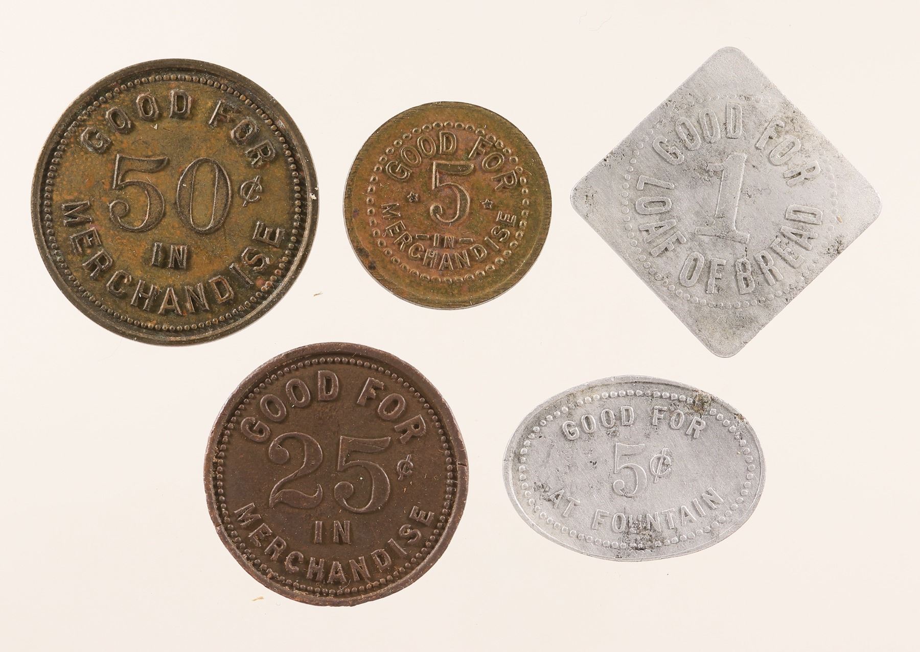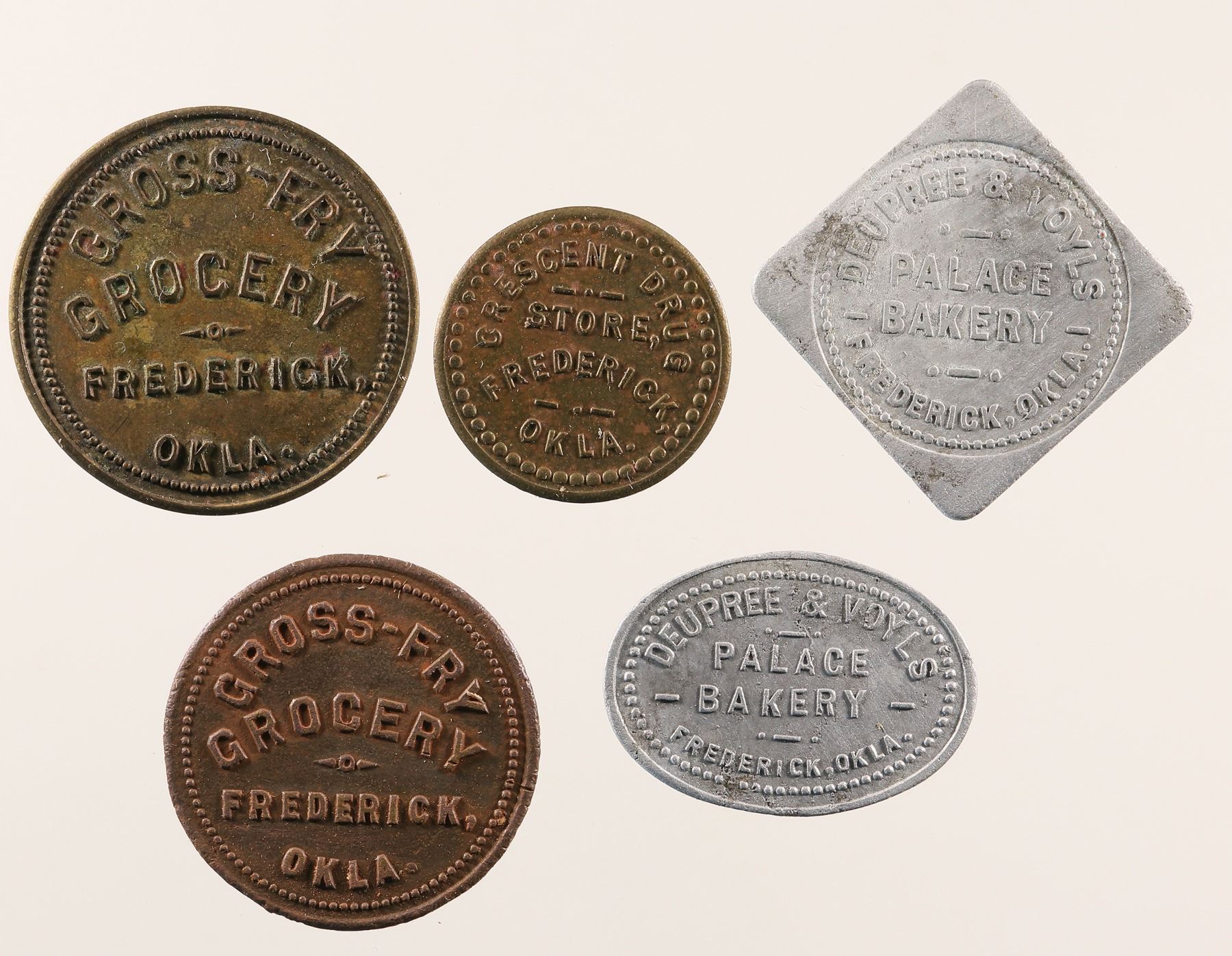 5 Blaine County, OK tokens. Crescent Drug Store, Frederick, Okla 5c. Dupree & Voyls Palace 5c, 1 loaf bread. Gross-Fry Grocery 25c, 50c.
