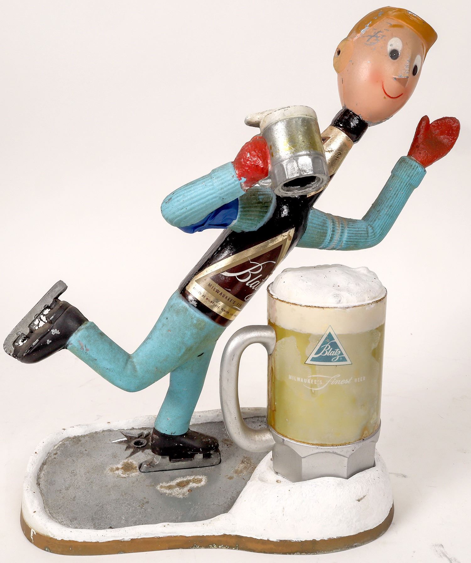 Four Vintage, All Original, Cast Metal, BLATZ Beer, Advertising Figurines/Statues plus Four Vintage Heidelberg Beer Barrel Steins and 3 miniature Blatz Beer bottles. 1-2) Waiter figures w/ trays, one is missing beer mug on tray, approx. 16" tall on 6 x 4" bases. 3) Skater w/ one damaged arm, 16" tall on a 12 x 6" base. 4) Banjo player sitting on a stool, 12" tall. See photos for condition issues. The Valentin Blatz Brewing Company was an American brewery based in Milwaukee, Wisconsin. It produced Blatz Beer from 1851 until 1959, when the label was sold to Pabst Brewing Company. These iconic back bar display pieces are some of the most beloved examples of vintage breweriana and highly collectible. PLEASE SEE the Blatz Beer Cast Iron Milwaukee Braves Promotional Display Figure located in the sports section.