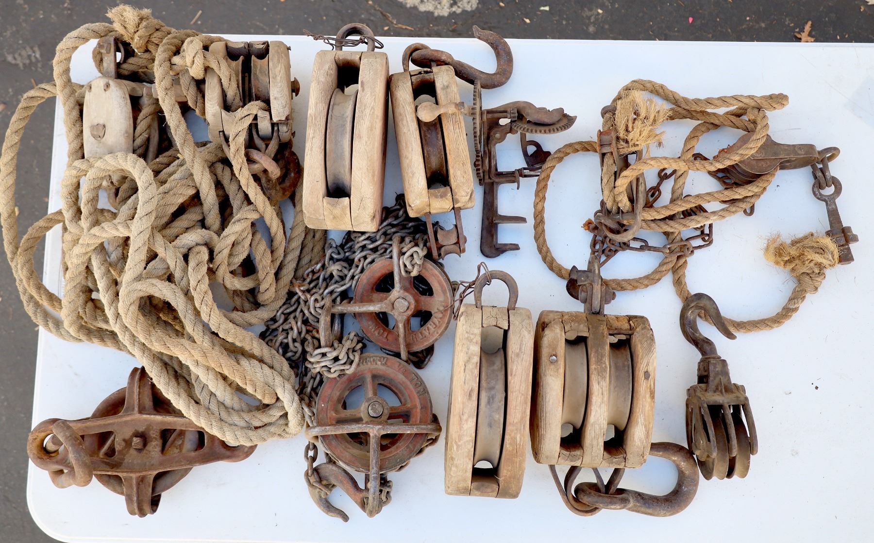 9 vintage block and tackles, 1 with long original rope. Mix of all metal and wood/metal. About 10" each. 2 more, 1 with long chain. Also 1 metal E C Simmons Keen Kutter for unknown use. About 100 lbs.