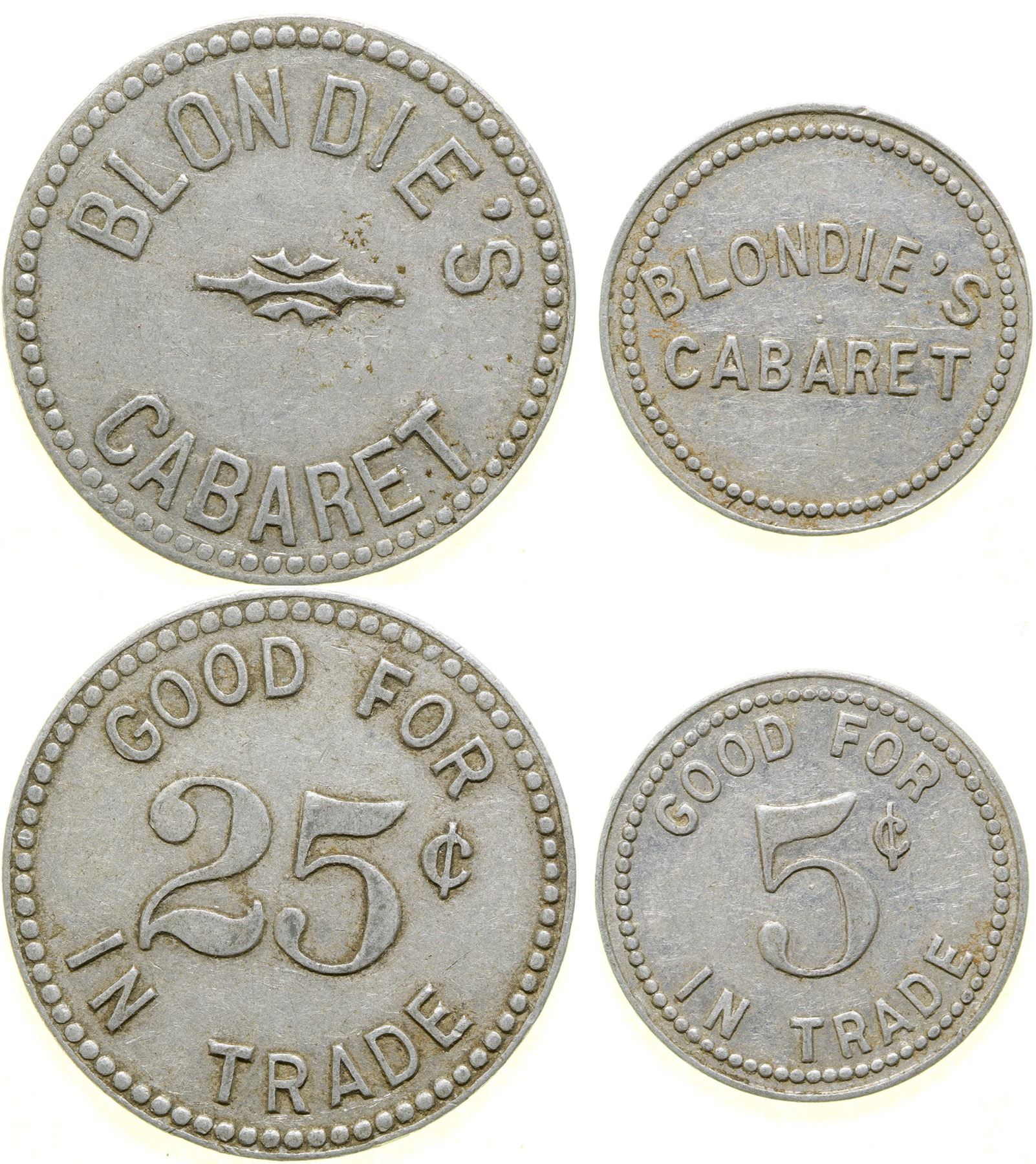 First is 20 mm, round aluminum token, TC 417580. Obv: BLONDIE"S CABARET. Rev: GOOD FOR 5c IN TRADE. Second is 26 mm, round aluminum token, TC 57533, NTCA 1161. Obv: BLONDIE'S / design / CABARET. Rev: GOOD FOR 25c IN TRADE. Roger Merritt Token Collection