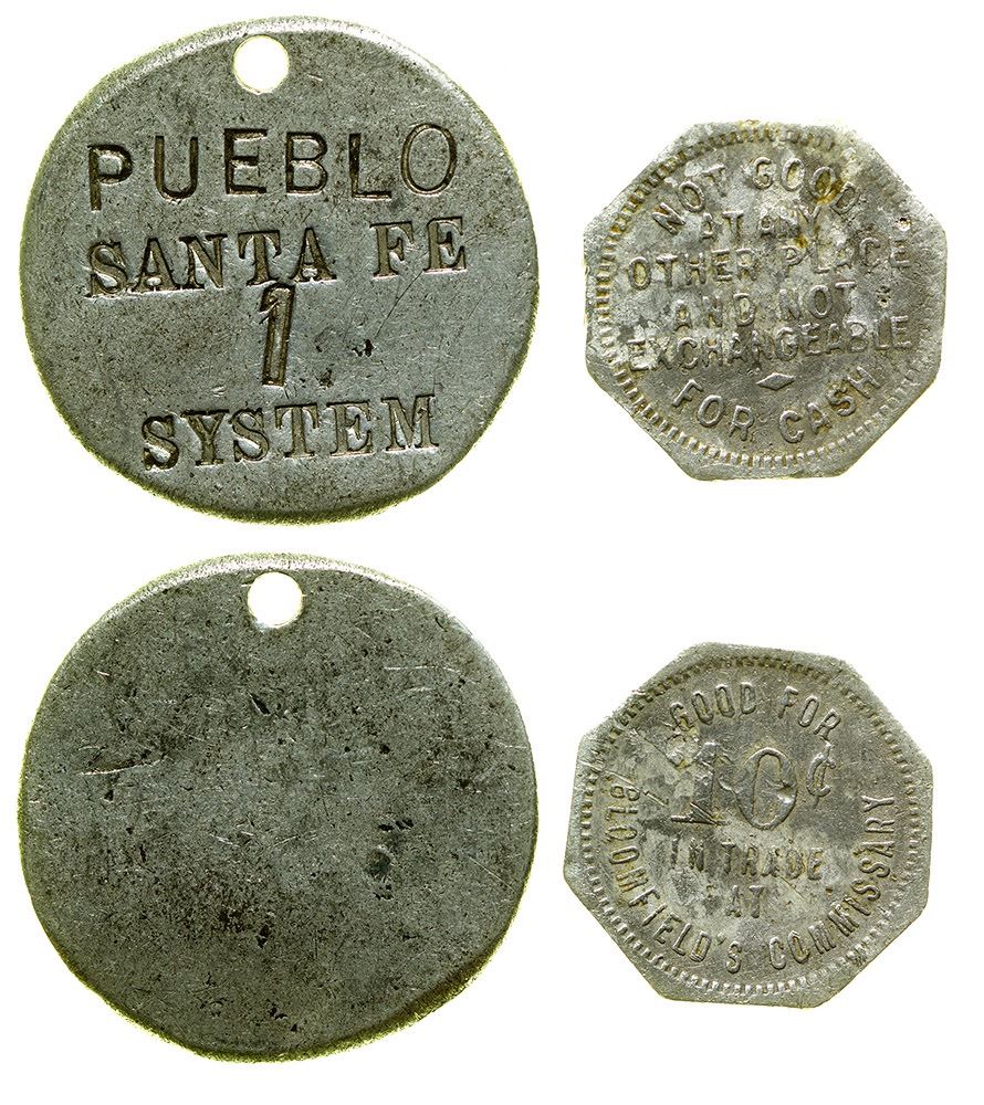 Obv.: Not Good / At Any / Other Place / And Not / Exchangeable / For Cash ; Rev.: Good For / 10c / In Trade / At / Bloomfield's Commissary. Oct., Al, 23mm, R7. Also a round, holed, white metal "tool tag" stamped " Pueblo / Santa Fe / 1 / System. Uniface. Two pieces. City: Prewitt State: New Mexico Date: HWAC# 51320