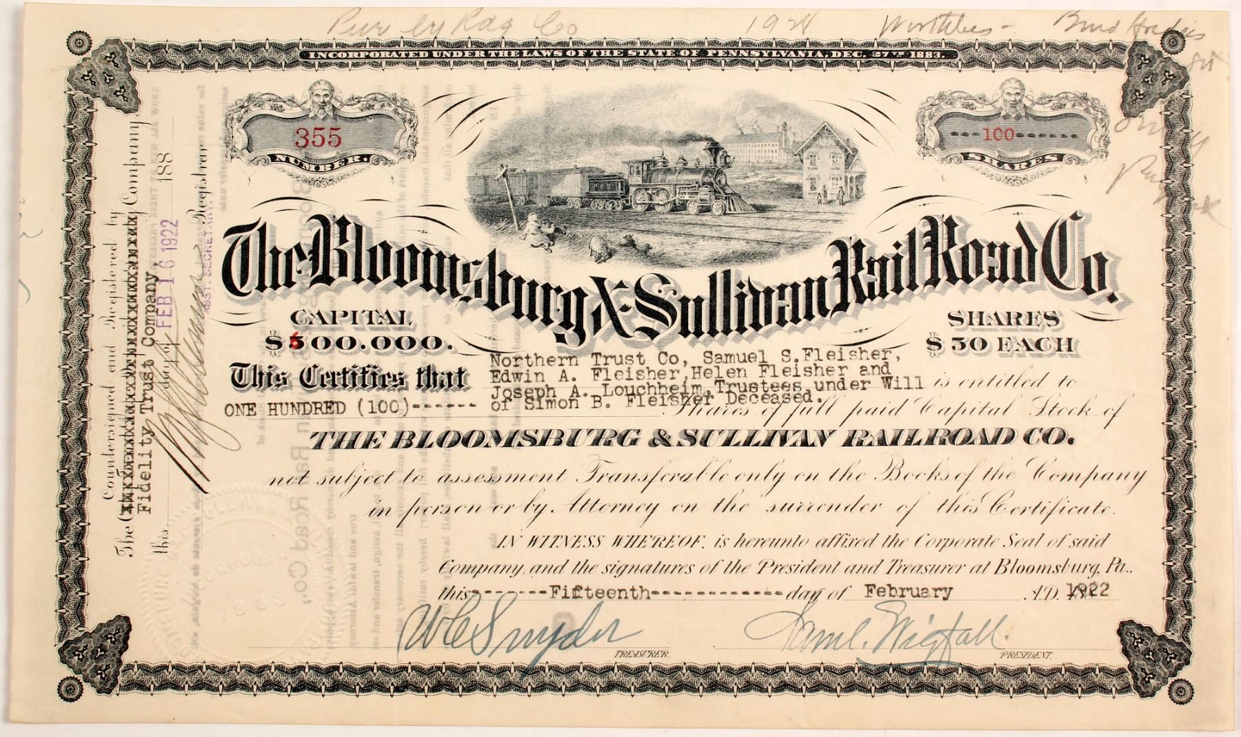 One hundred uncancelled shares Bloomsburg & Sullivan Rail Road Co. dated February 15, 1922. Number 355. The charter for the Bloomsburg and Sullivan Railroad was granted in November 1883. In 1886 Charles R. Buckalew became president. The railroad was completed in 1888, and service began on November 30. The first freight shipped on June 21, 1887; first passenger train on the railroad ran in September 1887. By 1915, six passenger trains and several freight trains were running on the railroad each day. The railroad went bankrupt in 1928. Freight service stopped in 1969. Unlisted in Cox. Ken Prag collection.