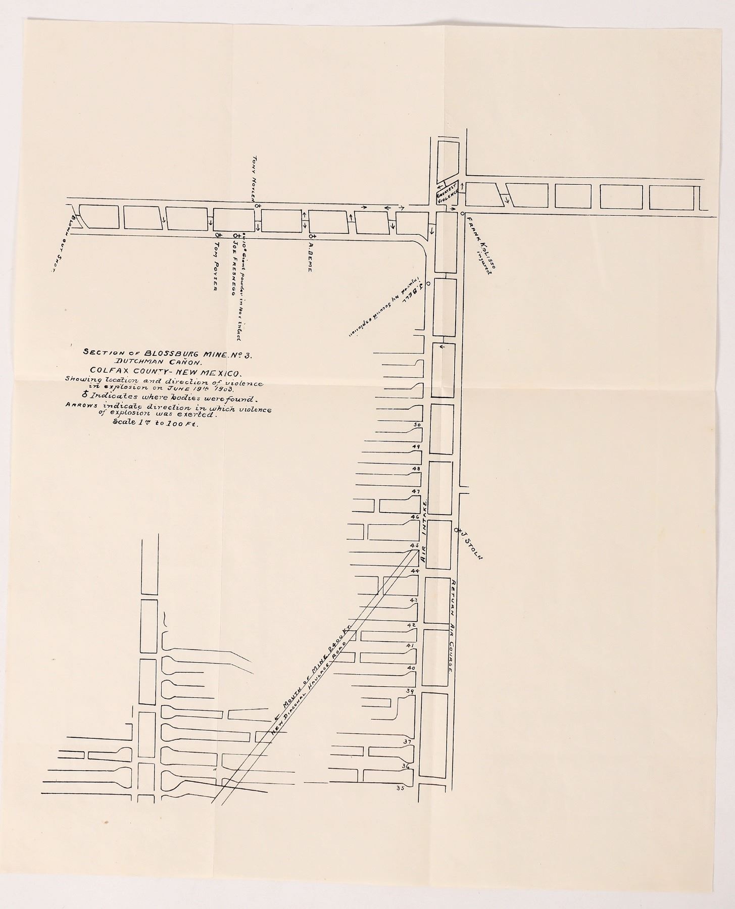 Very rare post explosion shaft map from Blossburg Mine in Colfax County, NM showing the location and names of men killed in the violent explosion on June 18, 1903. 14.5x12". Colfax County New Mexico